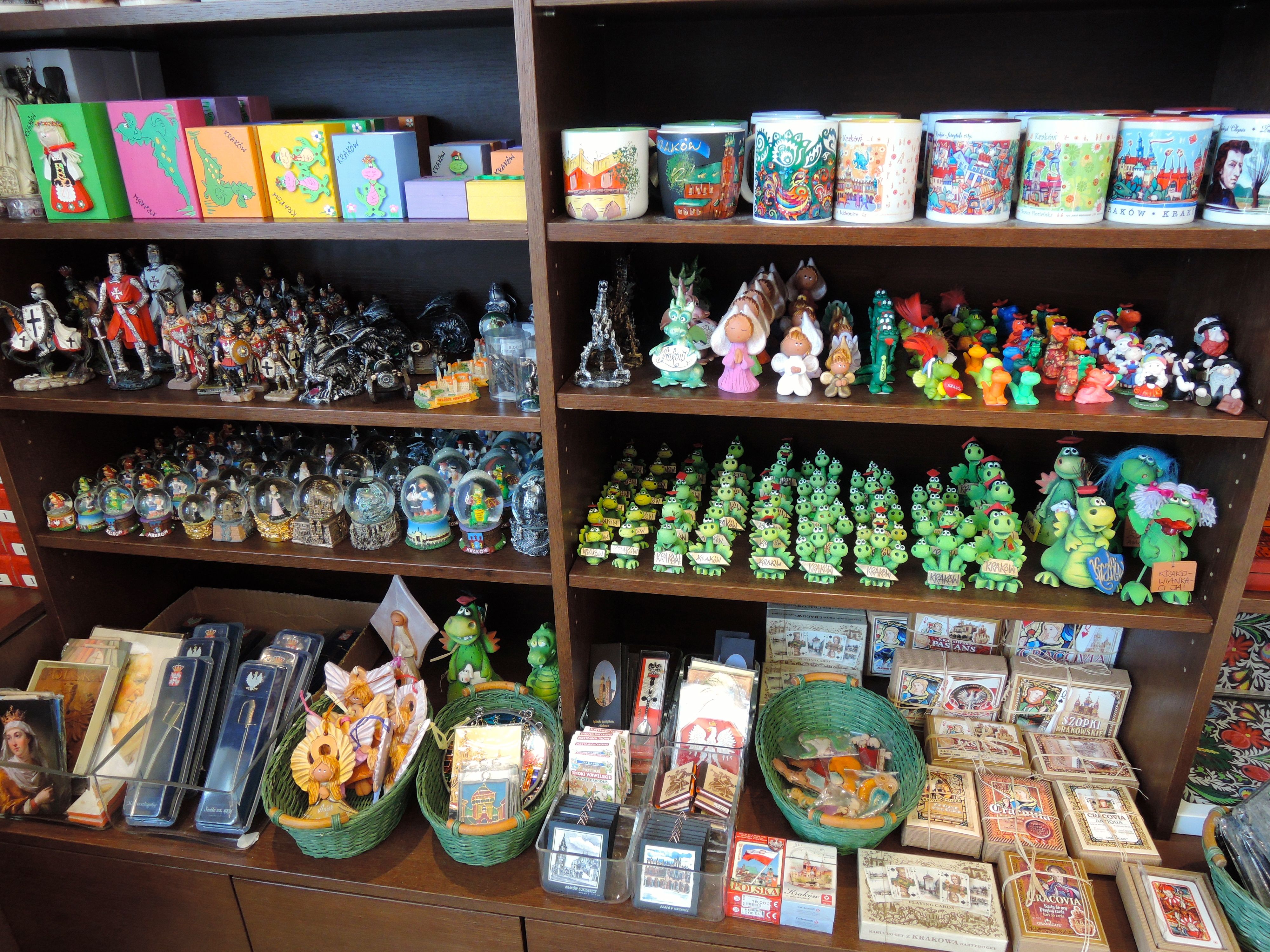 But into every castle/cathedral complex, ya gotta add a little kitsch, so here’s mine. Remember that Wroclaw had dwarves? Krakow’s got a dragon and he allegedly lived at the foot of Wawel Hill. He met his sad demise at the hands of the knight Krakus who founded the city. Happily the little guy lives on in the gift shop, as evidenced below: