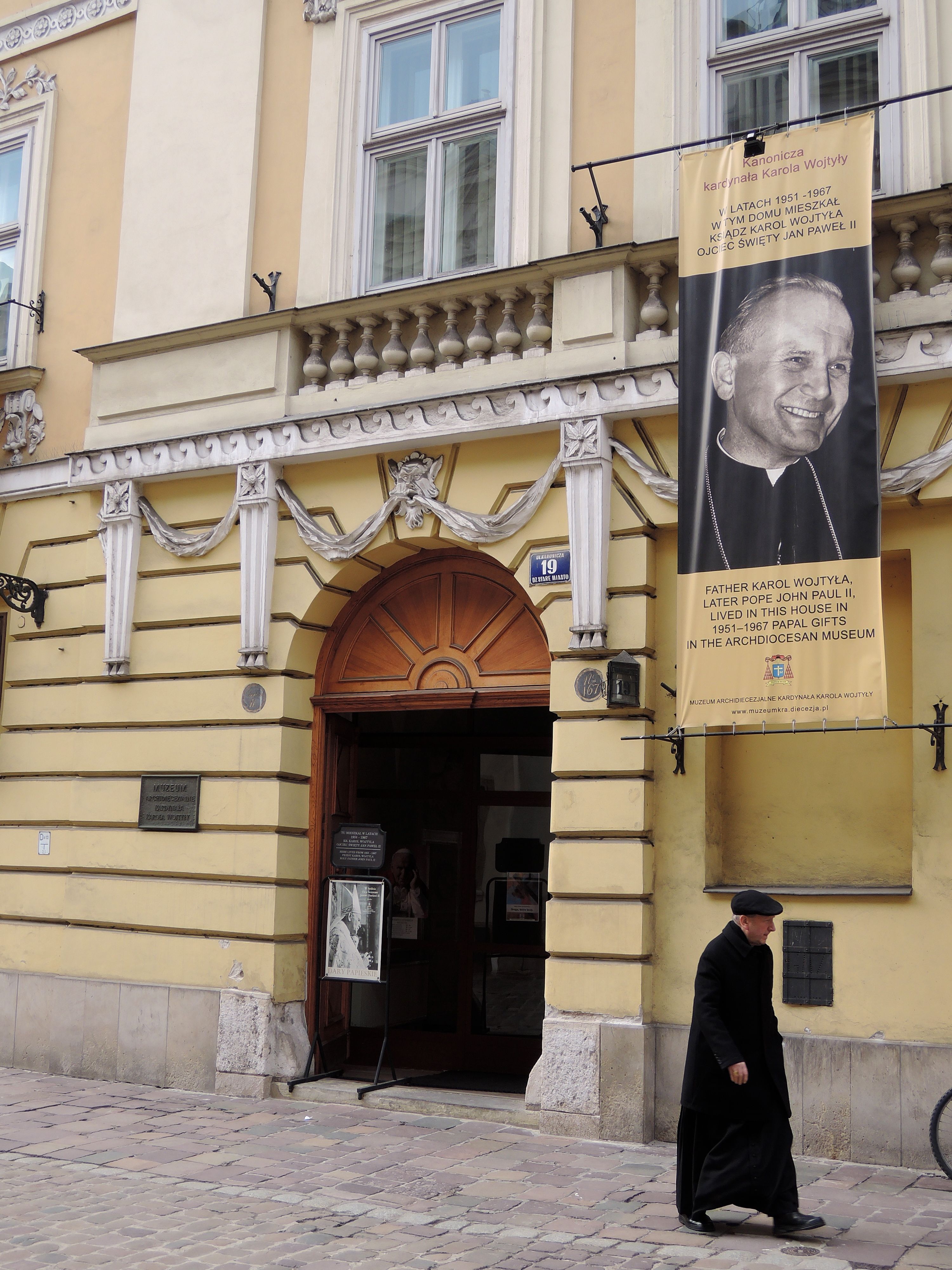 Stepping away from the main square, one walks down a long scenic pedestrian street towards the castle. I took a little byway one street off, and found this lovely building. As I mentioned earlier, John Paul II is one much loved local boy. But here’s the place where he lived during much of his time in Krakow, including, I believe, his student days and years as a priest before becoming Bishop: