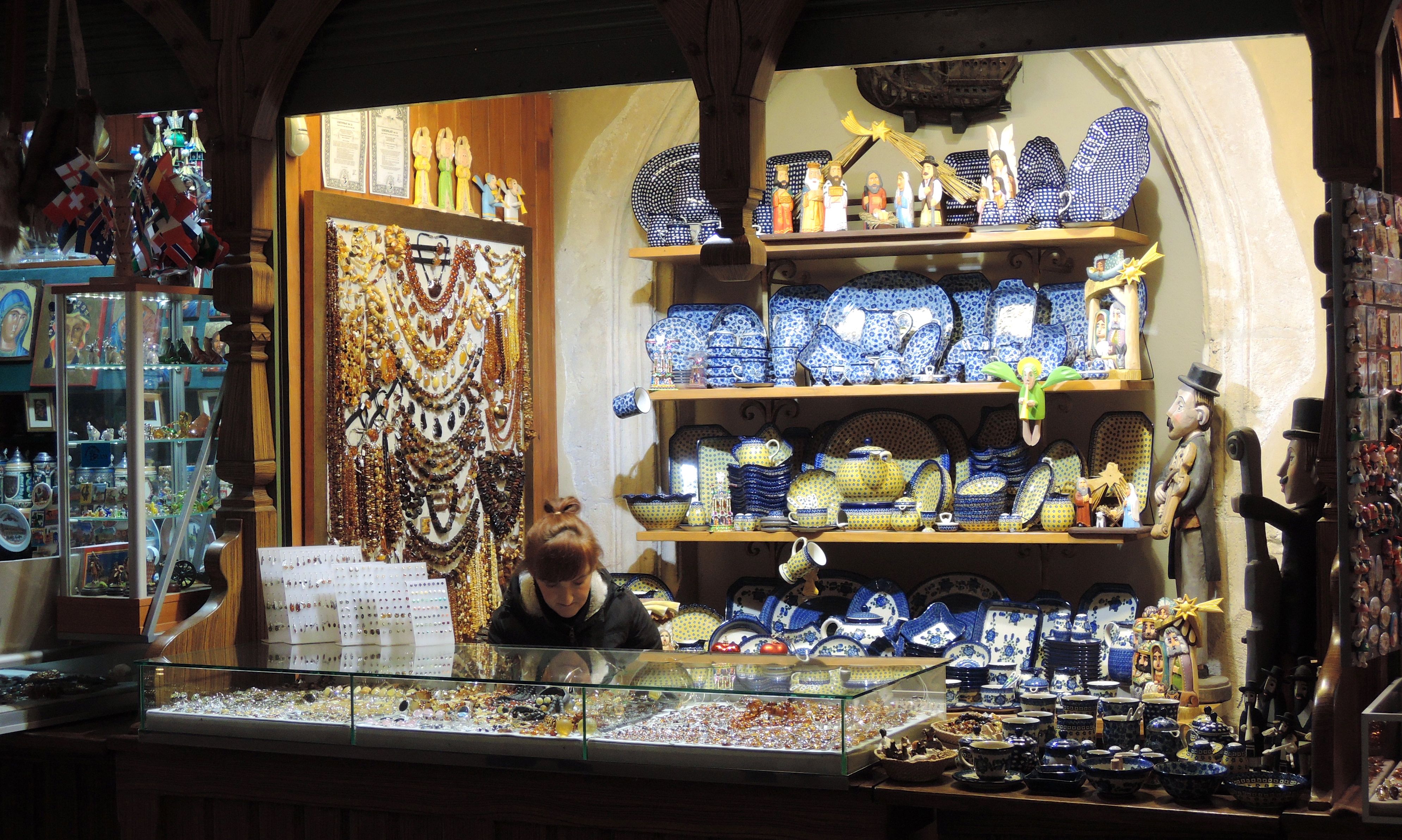 Inside this building (the cloth hall) merchants having been selling their wares for over five hundred years. At the moment, you’ll find a lot of lovely but very overpriced tourist souvenirs, predominantly amber and silver jewelry (national specialty) and some traditional Polish ceramics. One saleswoman is either inspecting her wares or checking her Facebook account: