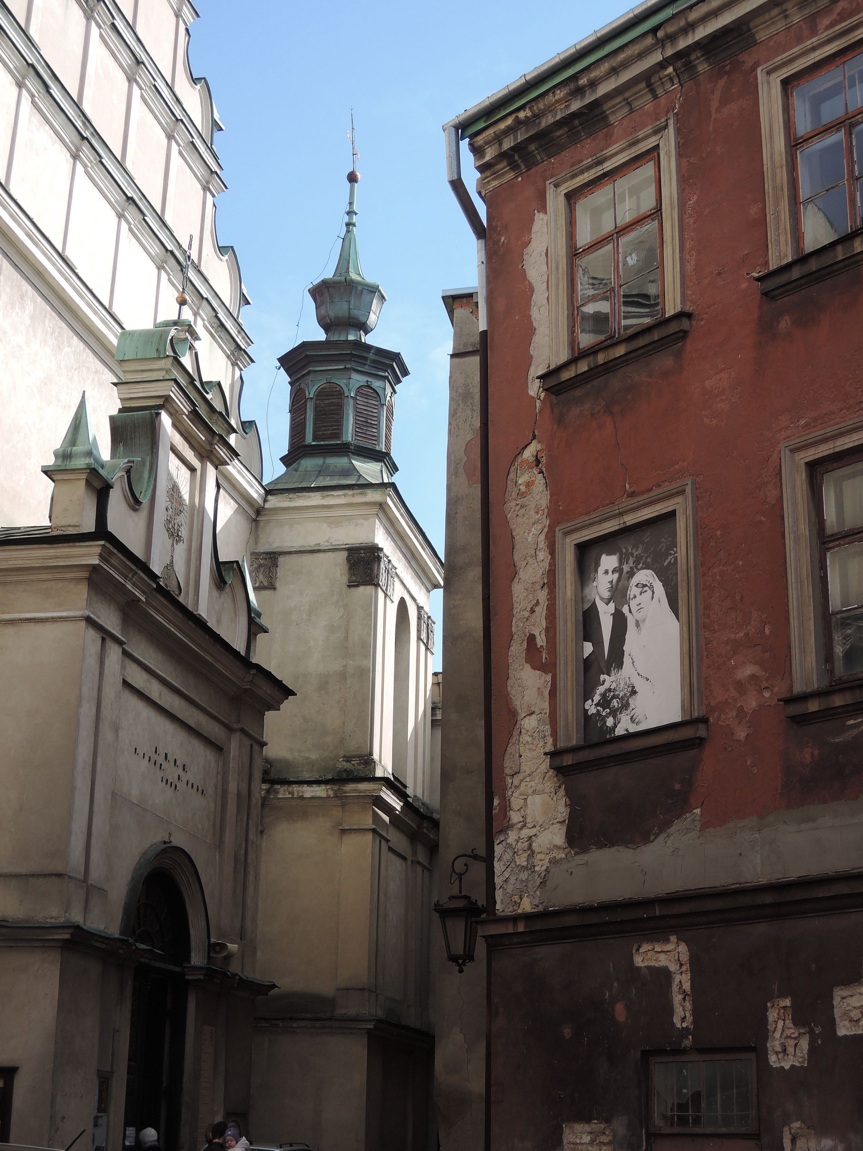 …begins to address liminality. The Jewish Virtual Library tells us, as I suggested earlier, that “Lublin once served as one the most important centers of Jewish life, commerce, culture and scholarship in Europe. It had the world’s largest Talmudic school, Yeshybot. Lublin was also well known for its fairs and market days. Little remains today of its past splendor.” Is this a picture of a Jewish couple or a Christian one? Why the remembrance at all in that window, if not to commemorate….something? And just to the left of the church you see there (dark arch), the post-communion book sale had a little something for everyone: