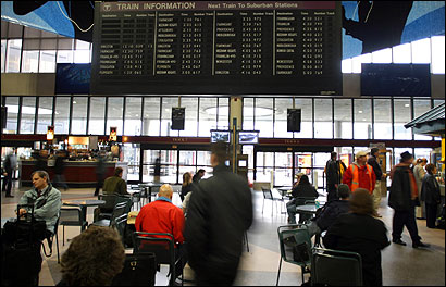 All that being said, it had been a while since I had traveled on an American train, Amtrak to be specific, and even longer since I had spent two and a half hours waiting for one, this time in South Station, Boston. My hyper-caution got me there so early in the morning that Starbucks hadn’t even opened yet (thank God for Au Bon Pan, ten feet away, which was doing a land-office business at 6:45 am). After a couple quick strolls around to enjoy the massive ads for T-Mobile and check out all the fast food options, I had a lot of time to sit and wait and people-watch and then really pay attention to the Public Service Announcements (PSAs) that were playing pretty consistently on big screens on the wall facing the trains (not yet installed in the above borrowed image).