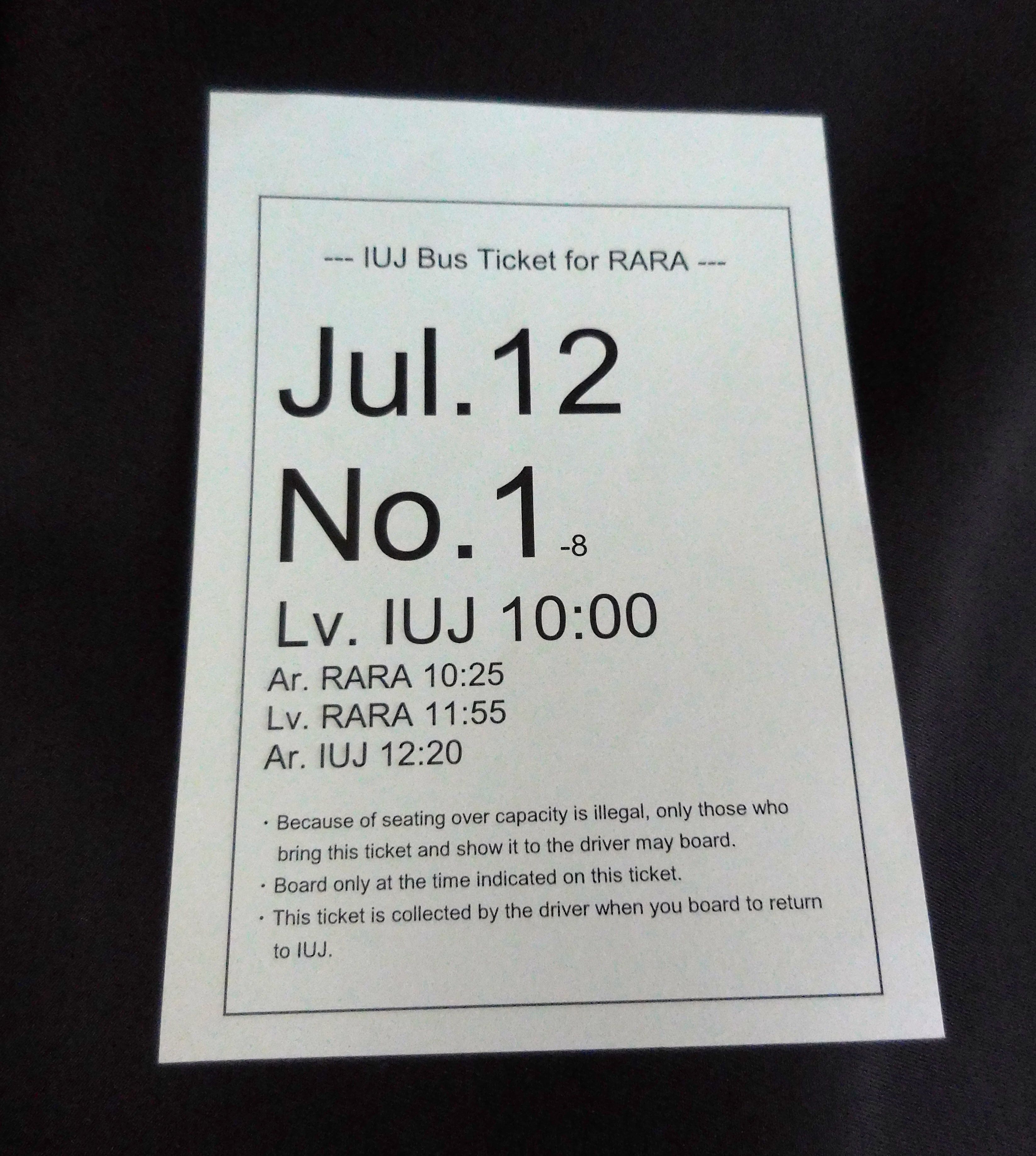 Pay particular attention to the time chart at the bottom of the page for RARA (pronounced LALA) on Sunday. (This is serious stuff.) If you can make out the times and the direction of travel, you can see that on Sunday, the bus leaves IUJ at 10:00 am, drops off the first crew at the store, returns, picks up the second crew, goes back to the store, drops crew #2, picks up crew #1, returns to school, drops off crew #1, picks up crew #3, goes to store, picks up crew #2, goes to school, drops off crew #2, and then goes back to the store for crew #3. This is all done *by one driver.* And in order to be any part of this carefully choreographed transport dance…you must have a ticket: