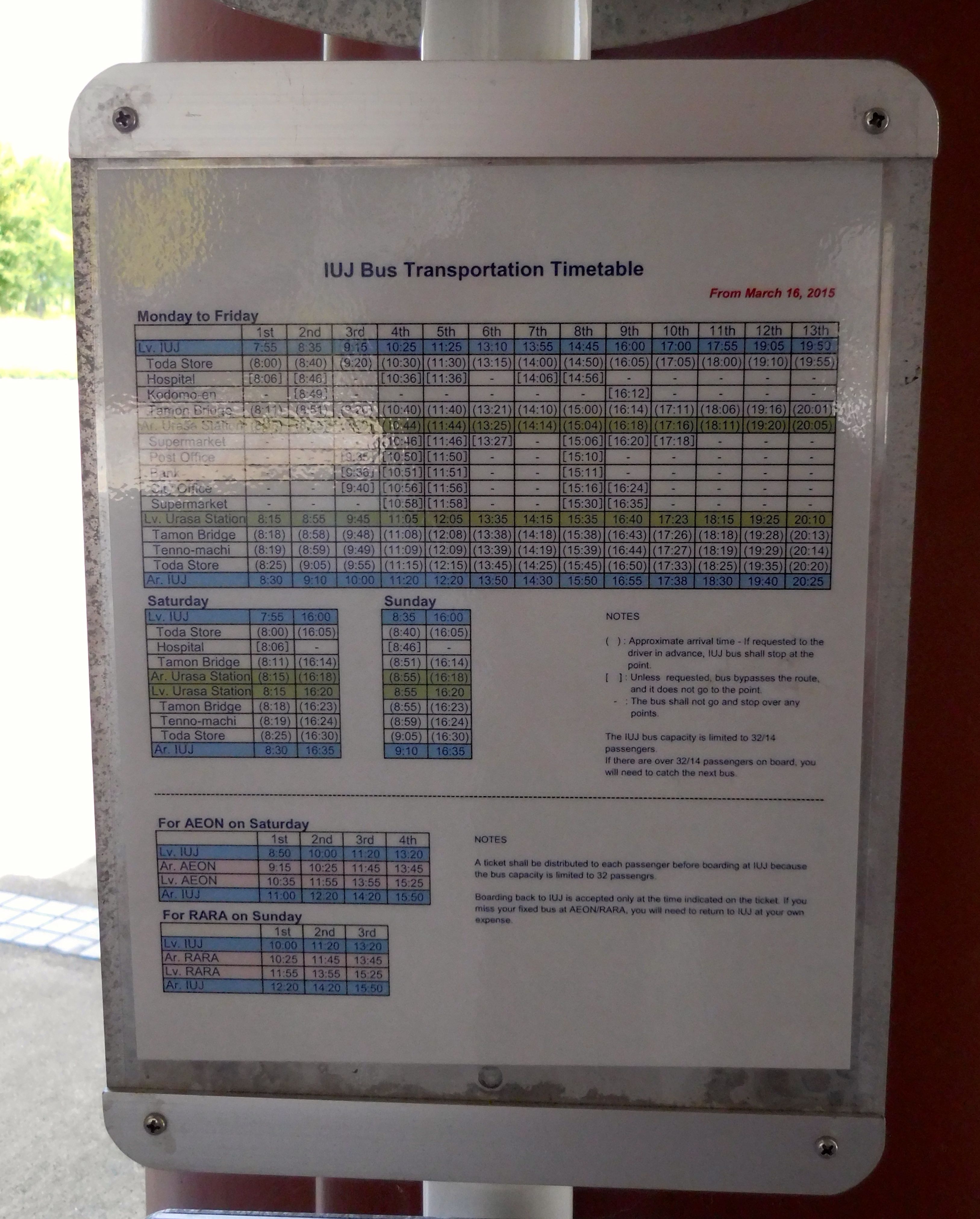 This is one of the IUJ minibuses which (thankfully) has several routes around the surrounding environs in order to connect us with the outside world, more specifically, the train station, the hospital, and the local supermarkets. Here is the weekly schedule: