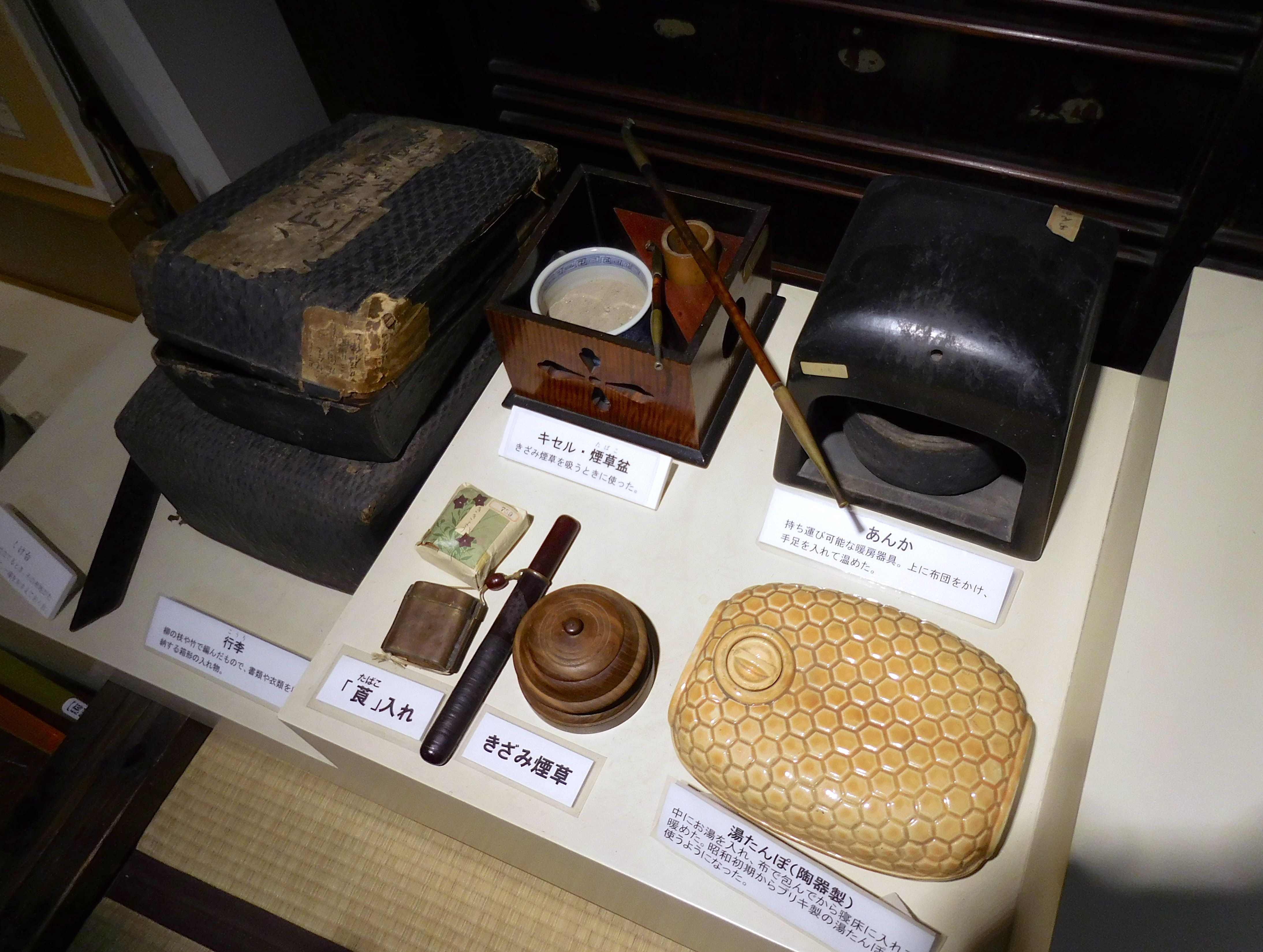 Tootsies recovered, we meandered nearby to the Yuzawa Town History Museum. Well worth the 500 yen entry fee (about four bucks), this building held a small but fascinating collection of archeological relics found in the vicinity (some pottery and arrowheads dating back millenia) as well as a some beautifully presented artifacts of how life was lived in the mountains before the advent of modernity, grouped by season and the tools used in each. There was also a small exhibit honoring the famous novel and its author, including the kimonos he wore, his Tiffany travel clock, the Chinese cups for his green tea, and most interesting to me, a photo of the actual pens he used while writing, several of which were my favorite Montblancs.
