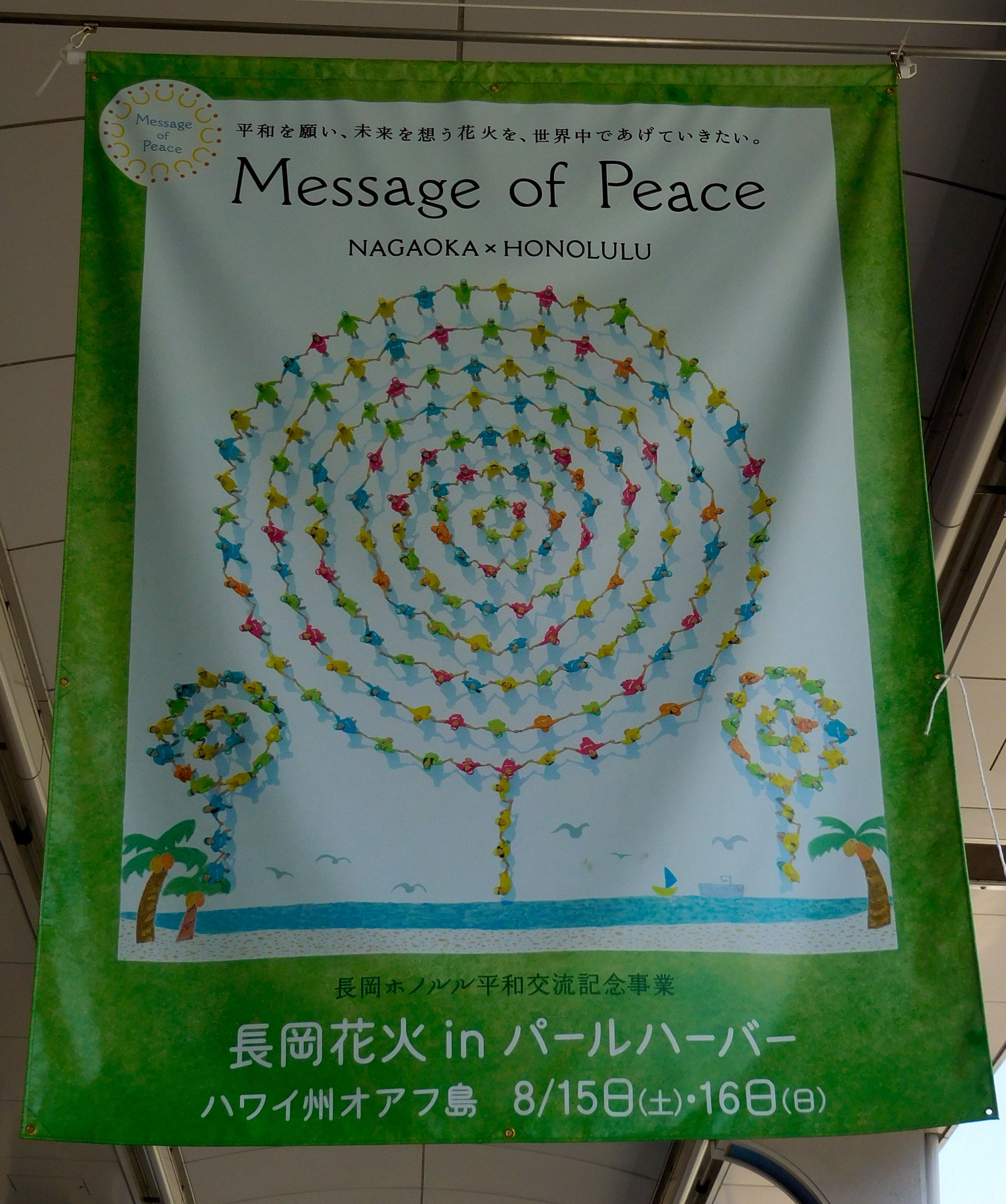 The good news is that the local citizenry live in the here and now, and they have a very active sister city relationship with Honolulu, Hawaii (as well as Fort Worth, Texas, and Trier, Germany). This year, the famous Nagaoka Fireworks, held locally on August 2nd and 3rd, will be seen in Pearl Harbor on August 15th and 16th. In addition, there is a beautiful artistic image of fireworks composed of 202 children and exhibit of nearly 6,000 cranes that will also be on display in Honolulu as well. Everyone here hopes and prays for a peaceful future, and I join them in that.