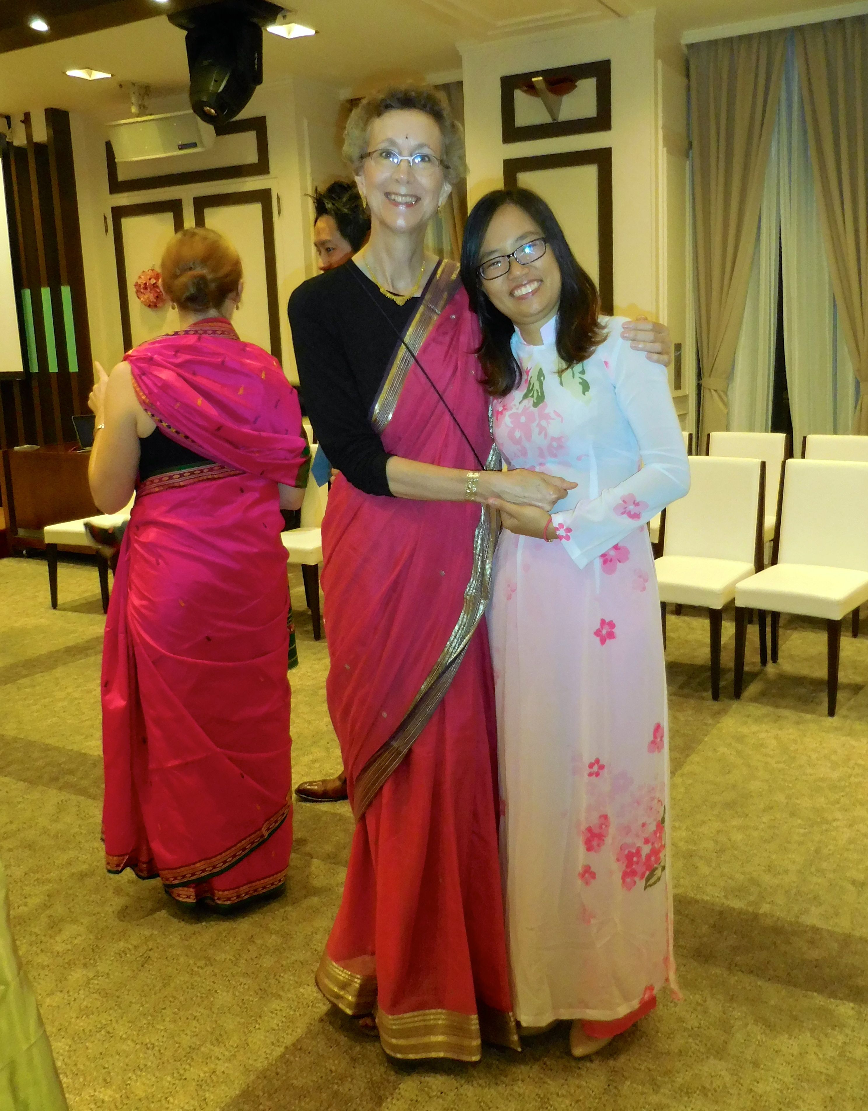 That evening was the official end-of-program bash, held at a local hotel and featuring a groaning buffet of local specialties.  As part of the fun, one of the full-time faculty wives shared some of her beautiful saris with the visiting female faculty members, and five of us headed off to the party looking like Bangladeshi princesses, complete with gold jewelry and even stick-on glitter and tattoos. Here I am in my regalia, again with Thu, near Rachel in the background: