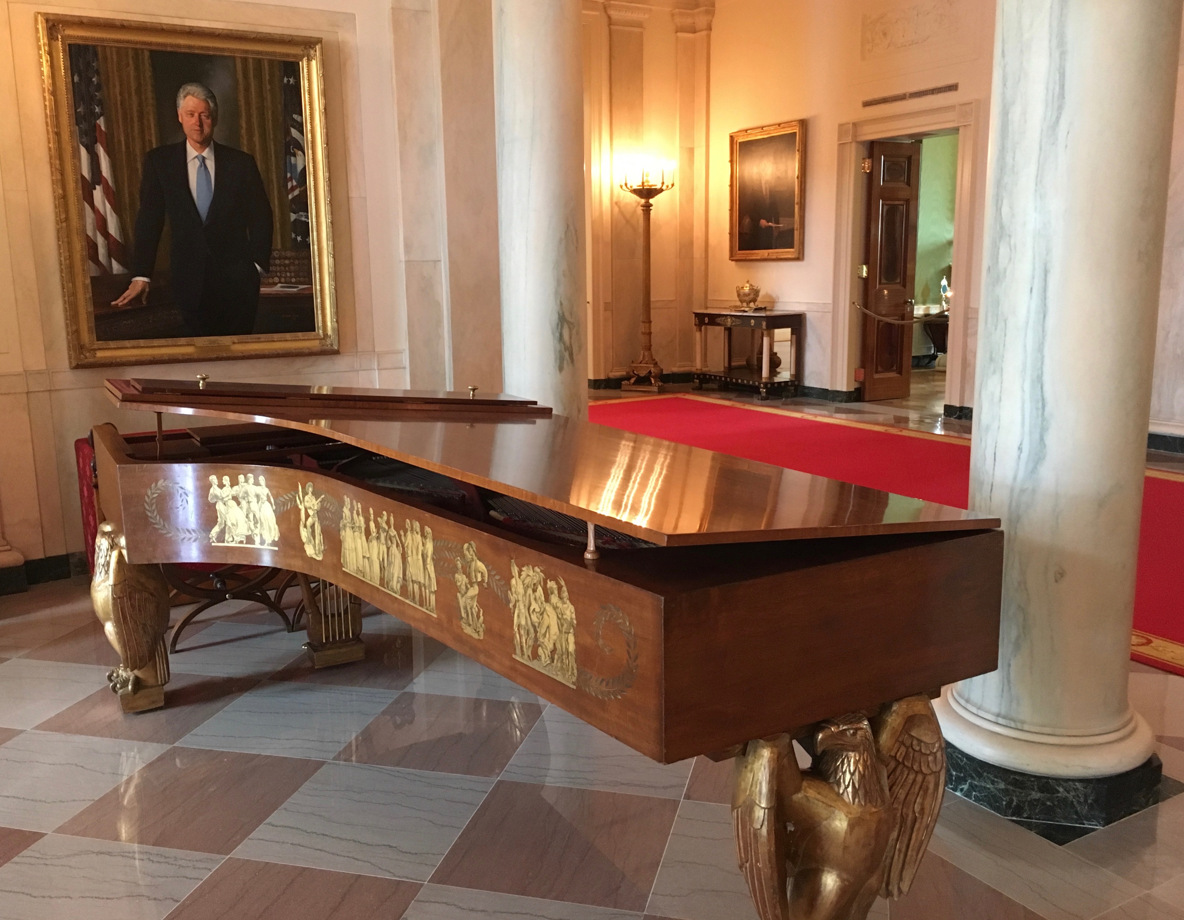 Down the hall to your left, if you followed the red carpet above, you would find yourself in the East Room, the scene of big dinners, receptions, and concerts over the centuries. Here both Abraham Lincoln and John F. Kennedy lay in state, and it’s also where the famous picture of Washington by Gilbert Stuart hangs as seen over the guide’s right shoulder: