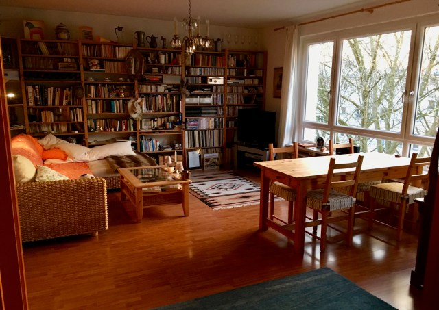 This flexibility brings me back to Berlin for the spring. Thanks to friends of friends, I am renting a lovely flat in a safe and quiet neighborhood near people I know and convenient to transportation hubs. Here’s a shot of the charming combined living/dining room space: