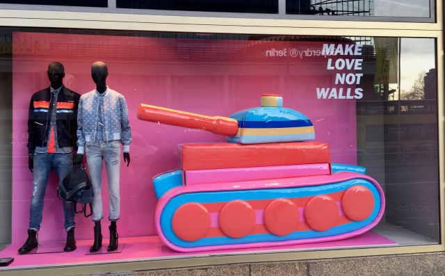 I walked by this same window a day or so later and saw it besmirched by some pointed profanity directed at the current occupant of the oval office, but I felt it deserved to be seen in its original state, so here it is. And the Berliners should know about walls already.