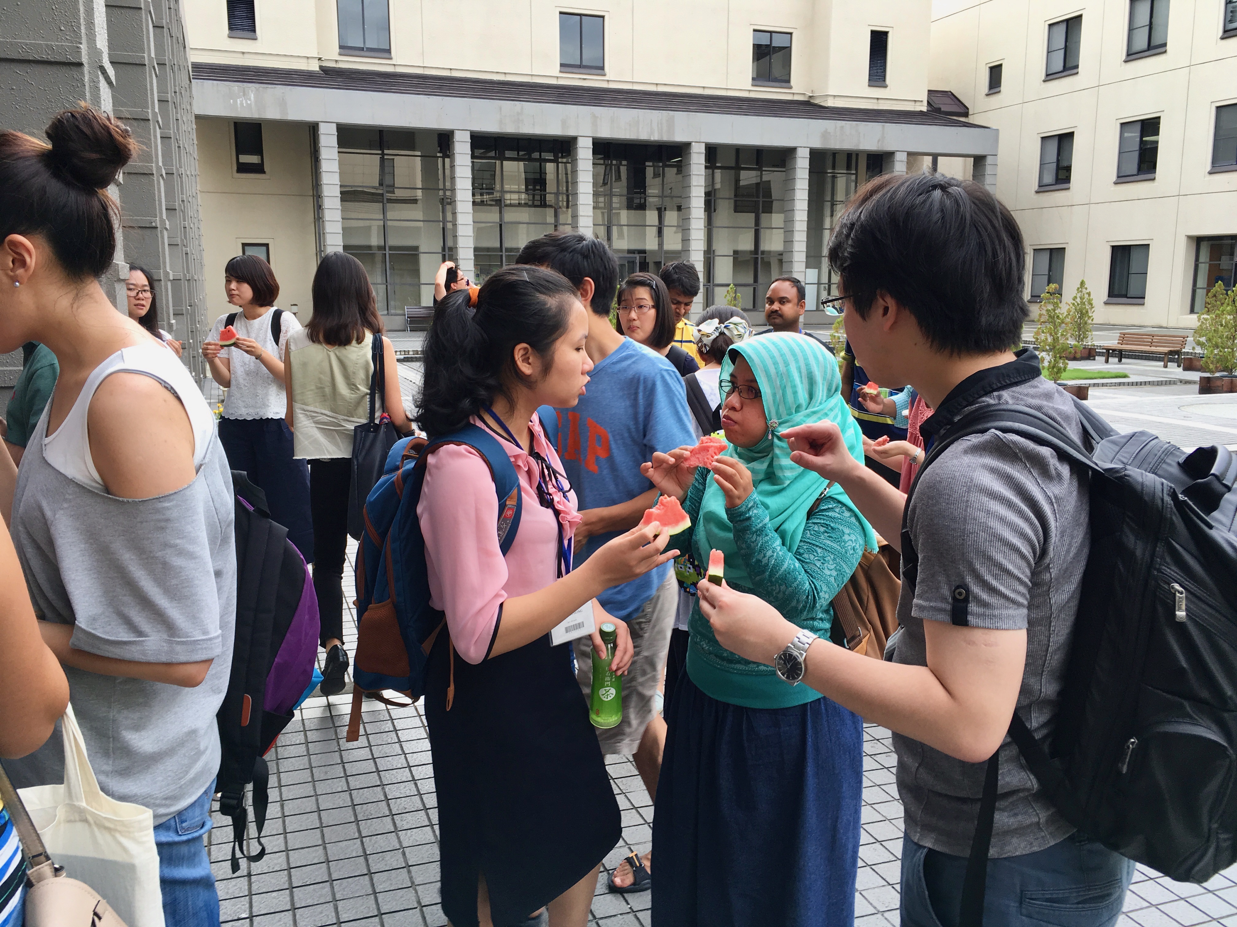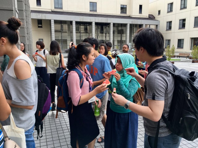 …and even more fun, a shot of one of the watermelon feeds that happens intermittently at IUJ when one of the faculty stumbles across a big one at a reasonable price. Chilled and sliced on a steamy afternoon….mmmm…nothing better…