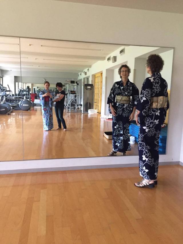 Also on the non-academic side of life, this year I did something new. Normally, the oral communications teachers (I am “Text Skills,” doncha know?) dress in traditional Japanese costumes for one of the summer social events, but this year I was convinced to join in as well (I didn’t think there would be anything…long enough for me). So thanks to a lovely student who loaned some of us her mother and grandmother’s yukatas (summer cotton kimonos), here I am with another faculty member being suited up in full glory: