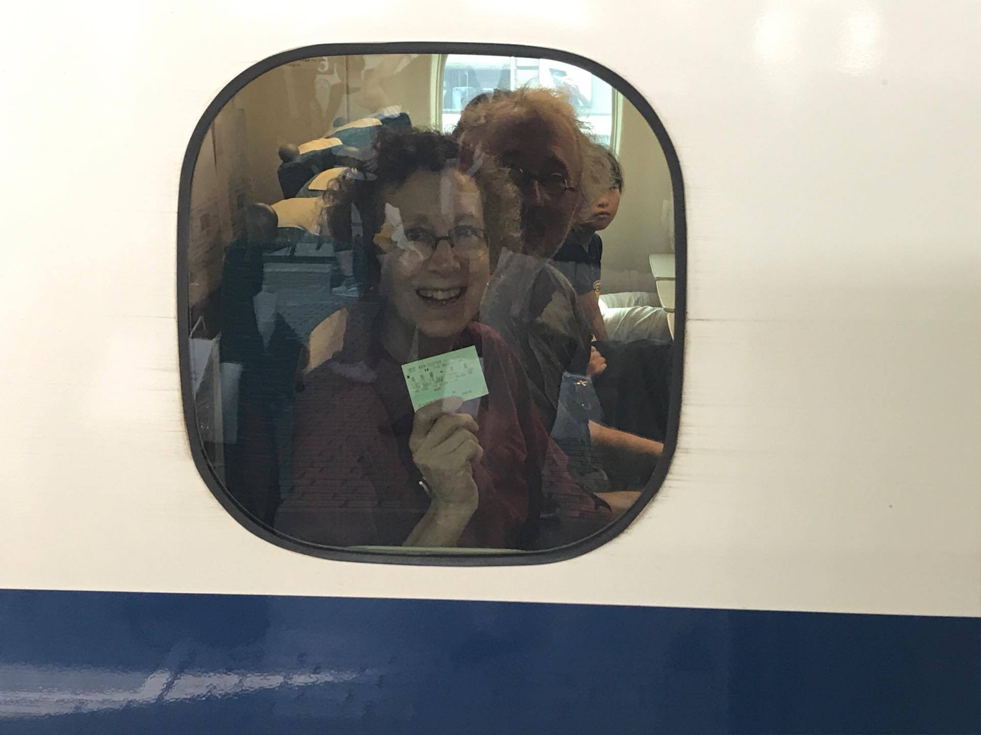 T and I have just returned from our wonderful week traveling in Japan. You may have seen my blog on Ginza, below, and we also spent a bit of time in Nagoya visiting a pen friend and touring Osaka with a delightful former student of mine. My focus for this trip, however, was on the former capital of Japan, Kyoto, a city I have hoped to visit for some time. And like all figments of imagination, my expectations of the place…were way off the mark. It was completely different from what I expected, and yet absolutely wonderful at the same time. Here’s a shot of the happy travelers on the shinkansen (bullet train) starting their way west: