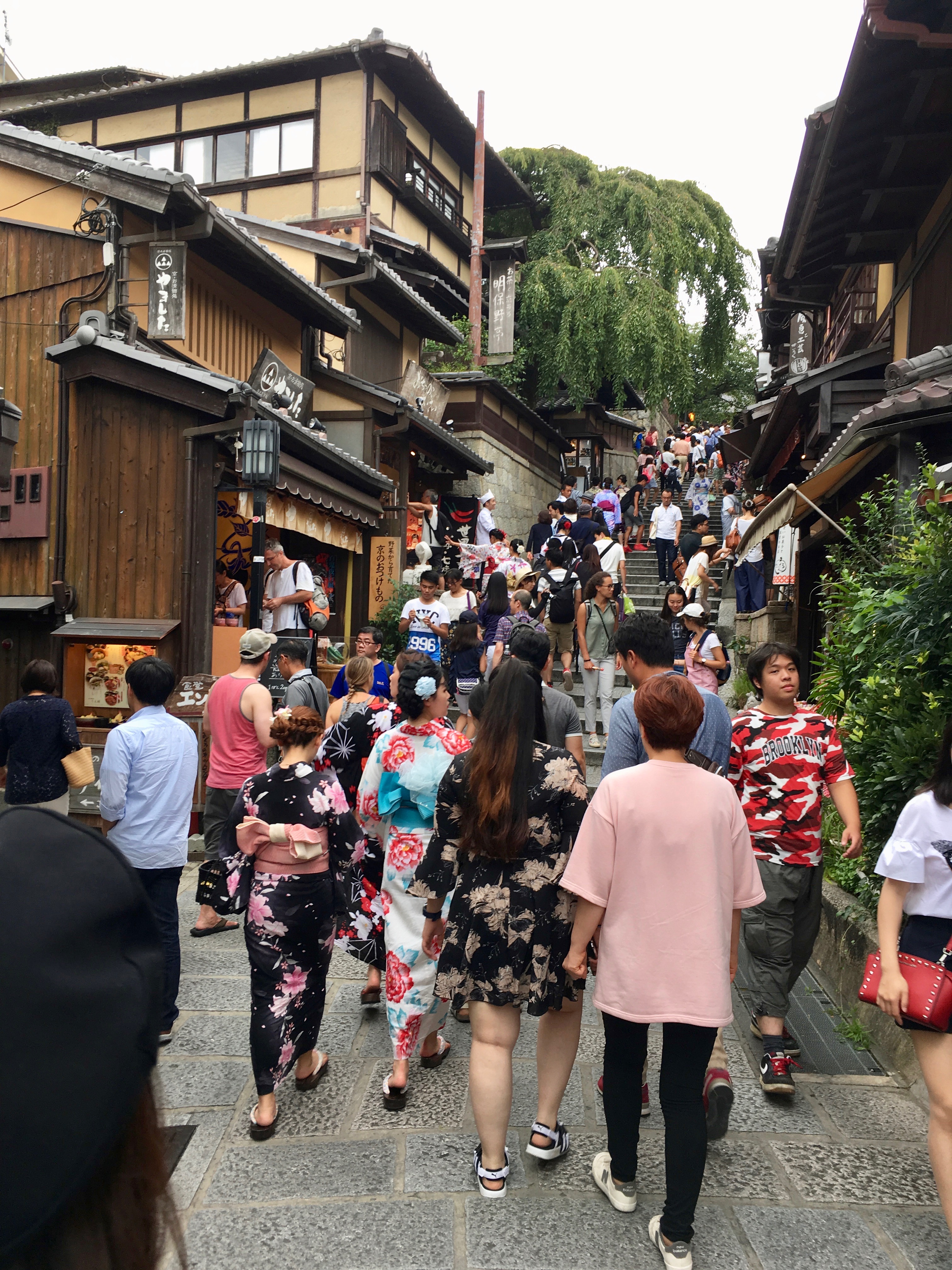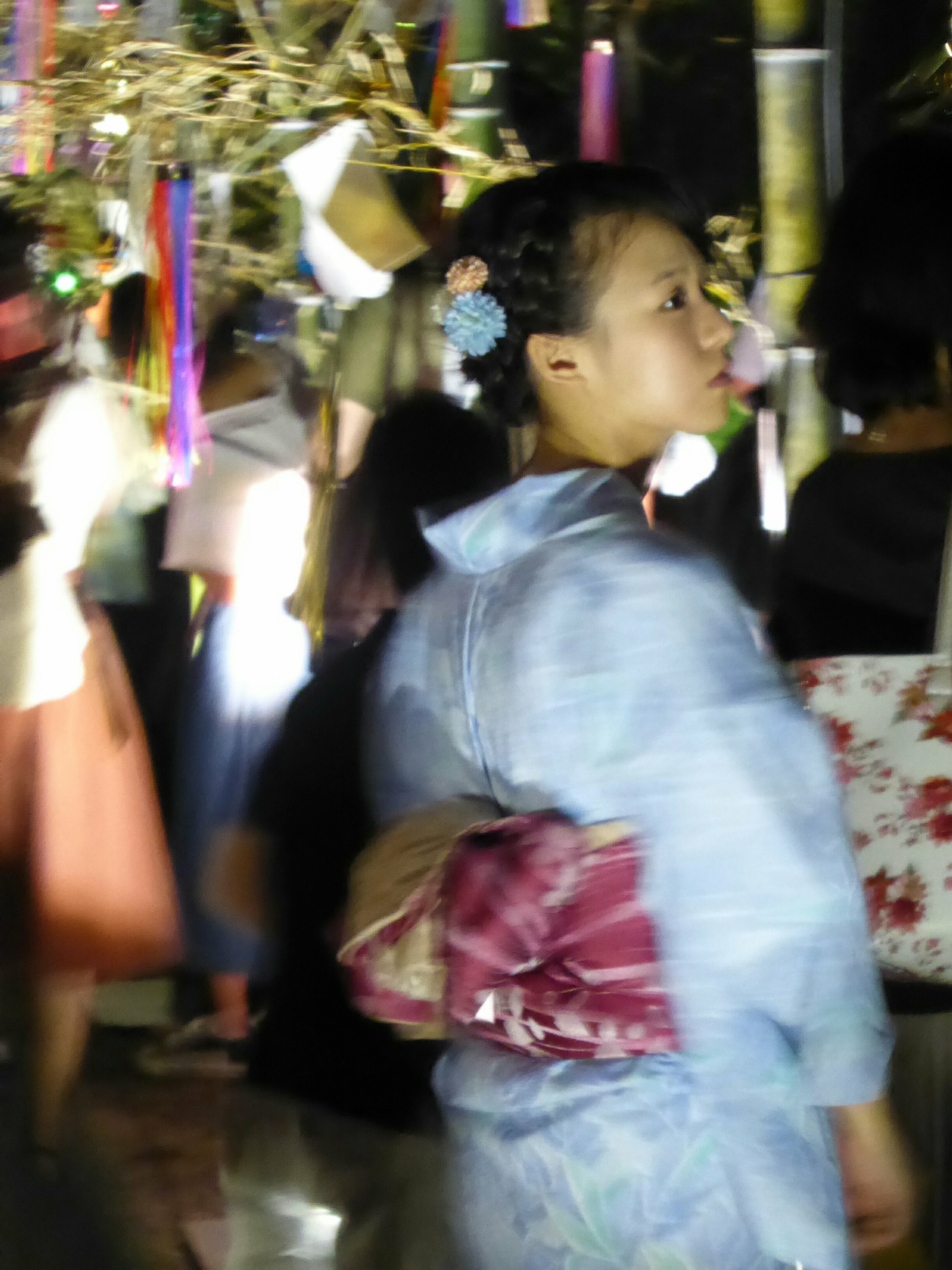 August is festival time in much of Japan, and Kyoto is no exception. Thanks to a most informative agent at the train station information booth, we learned that we had arrived on the last night of the Okazaki Promenade, “a feast of sound and stars,” in the words of the tourist brochure. In short, one six-block long stretch on Nijo Street was turned into a nighttime fairyland in honor of Tanabata, or Star Festival, a time when people write wishes and tie them to tree-like objects which are later burned to send the wishes to the heavens. It is, of course, much more interesting and complicated than that — see Wiki at https://en.wikipedia.org/wiki/Tanabata — but we just enjoyed being part of a big beautiful community event with loads of friends and families jostling along an illuminated path on a sultry steamy summer evening. T took this shot of a young attendee meandering just ahead of us on the path: