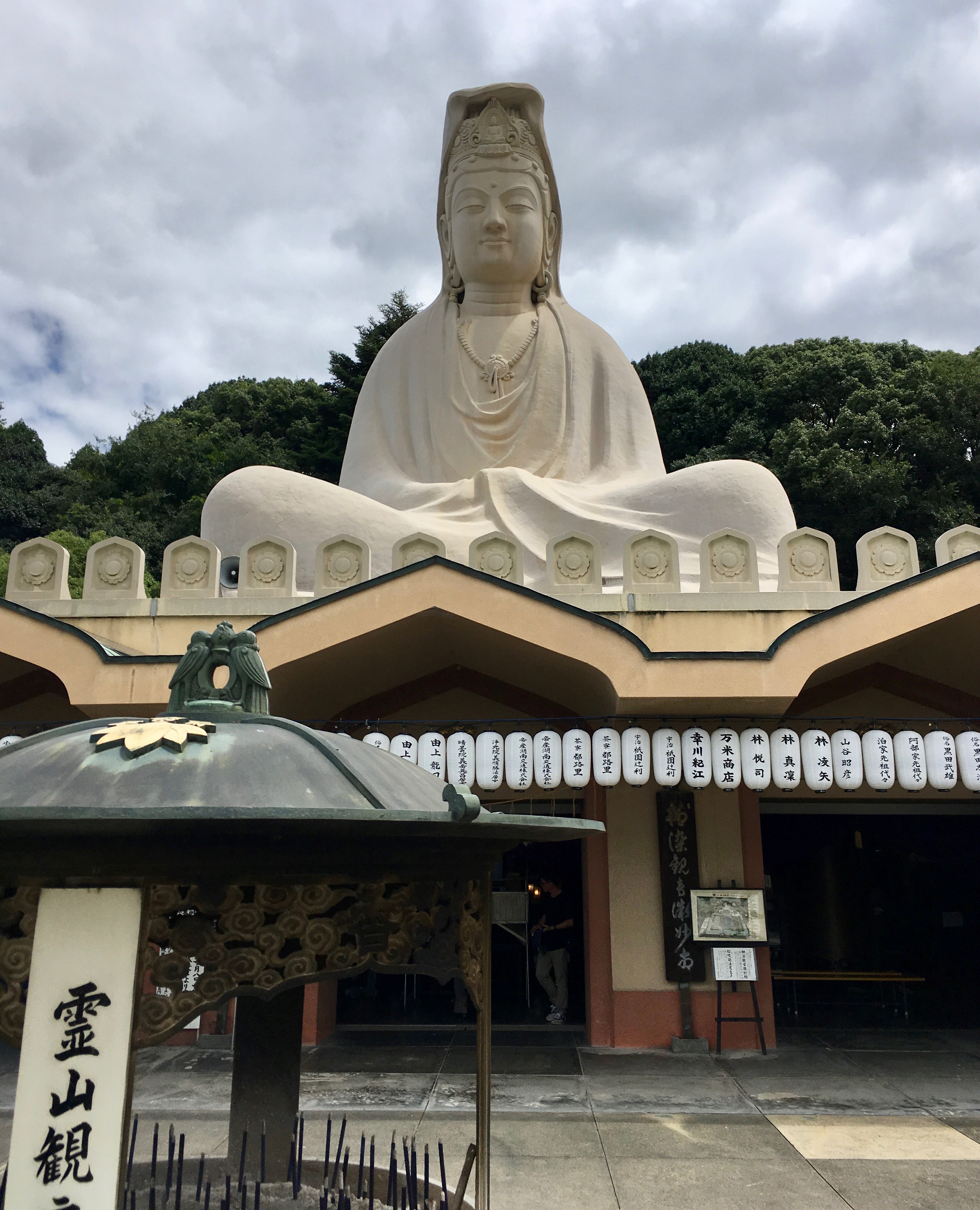 Nearby we stumbled across the Ryozen Kannon, “a monument to the second world war’s unknown soldier erected to the memory of more than forty-eight thousand foreign soldiers who perished on Japanese territory or on territory under Japanese military control.” This complex includes a shrine, a mausoleum, and a Buddhist “Homa” Hall. Looming over all is a 80-foot high concrete statue of the compassionate Bodhisattva Avalokitesvara (aka Kannon). This piece in addition specifically commemorates the Japanese “who sacrificed them-selves in the last war and for the establishment of a peaceful Japan.” T and I were touched by the sentiment (particularly at this moment in history) and added our incense and hopeful thoughts to the array: