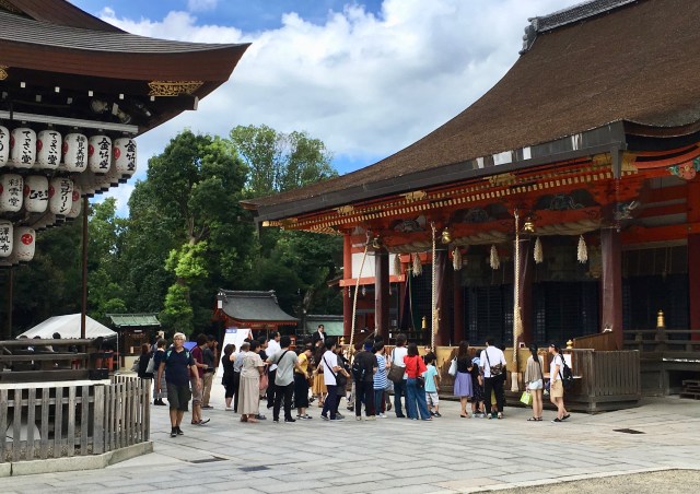 The next day we hit the tourist trail with as much enthusiasm as the humidity would allow. Our focus was the Higashiyama area in the eastern foothills of the city where a number of the city’s treasures are conveniently sprinkled along a walking path. This next shot is at the Yasaka Shrine, originated in the seventh century CE and one of the most famous shrines in Kyoto where, as T noted, we could actually see people engaged in their spiritual practice (unlike most of the religious sites in Europe where only tourists fill the aisles of churches and cathedrals):