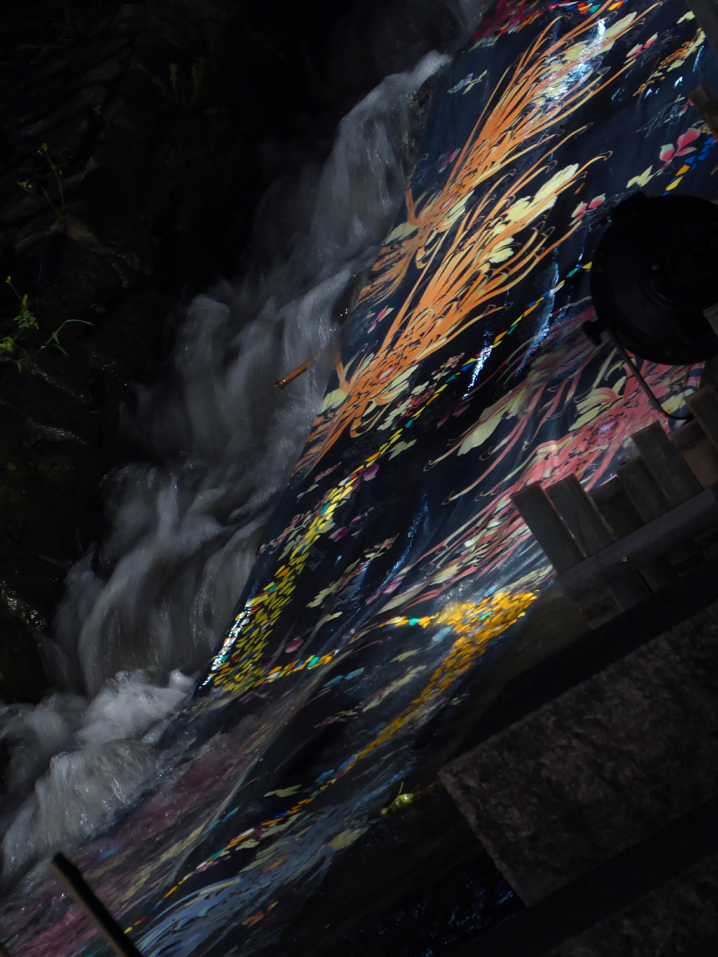 There was a section with lights overhead that shimmered and shifted to music, a section with trees covered in wishes, and a section with a small water channel containing a gorgeous silk strip of cloth, which was about four feet wide by 20 feet long and rippled over rocks and under water while being illuminated by carefully placed spot lights: