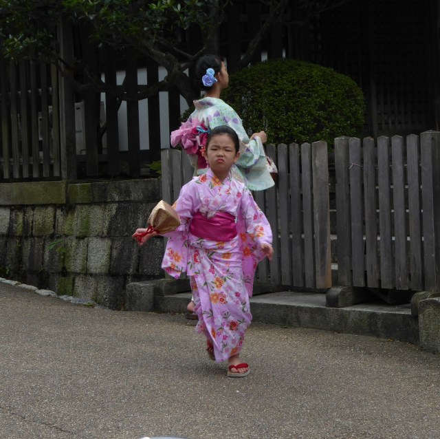 But by this time, the heat and history had caught up with us and we decided to head back and regroup. Before we could take our leave of this utterly lovely area (far too soon and with far more to be discovered on another trip, hopefully), T caught this view of a little geisha who had decided she also had had enough of being polite and pictured for the day: