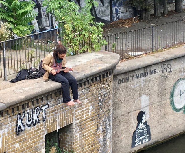 Back to me and back to Berlin. Probably the reason I feel so amazingly comfortable here is….it seems to be a home for misfits and expats. It’s a damaged place, a flexible place, a tolerant place, a transformative place. It seems to say to us all, locals and expats alike, “Come, relax, be, find yourself. Just be kind and tolerant to each other. That’s all I ask.” For example, here’s a fellow Berliner finding his spot on a recent warm fall day by a canal: