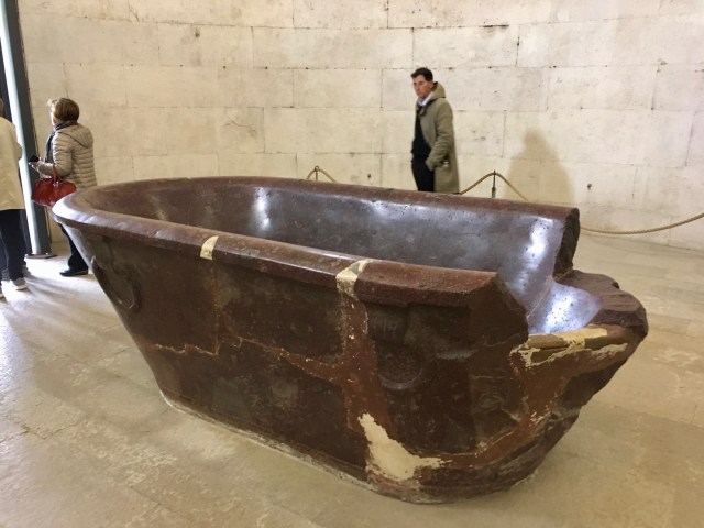 Speaking of tombs, the other biggie in Ravenna is the Mausoleum of Theoderic, located just outside the city. Now here’s an interesting dude that I had never heard of, but yowza talk about someone who lived at the crossroads of history and culture. Born in 454 in what is now eastern Austria near the Hungarian border, Theoderic was, according to Wiki, “king of the Ostrogoths (475–526), ruler of Italy (493–526), regent of the Visigoths (511–526), and a patrius of the Roman Empire.” Now that’s some resume. He died in Ravenna which had been his captial and was buried in the structure he had previously designed, but at some point his actual tomb itself was opened (the bathtub-like object below) and his bones scattered to the winds. Sic transit gloria mundi…