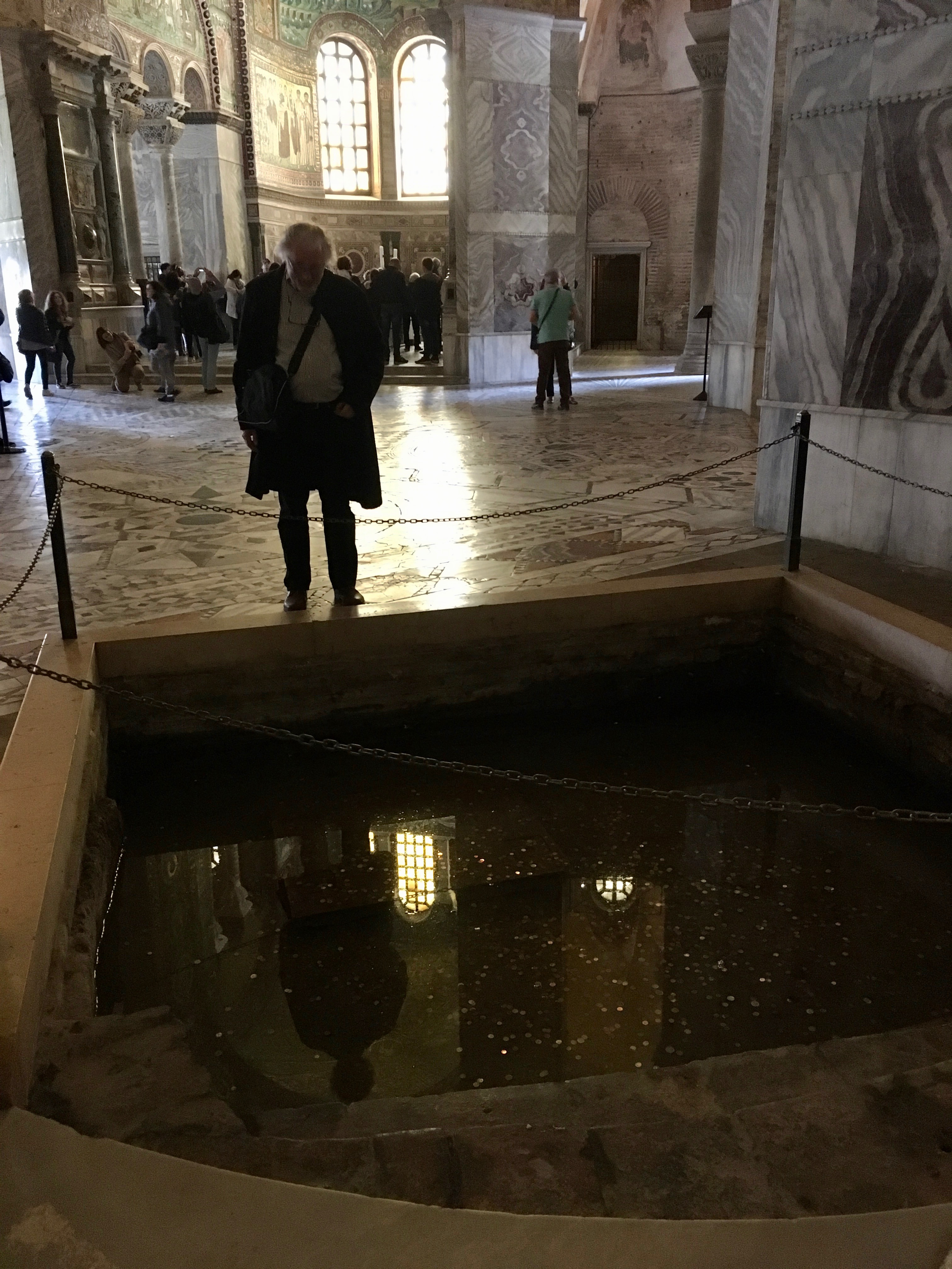 Speaking of tombs, the other biggie in Ravenna is the Mausoleum of Theoderic, located just outside the city. Now here’s an interesting dude that I had never heard of, but yowza talk about someone who lived at the crossroads of history and culture. Born in 454 in what is now eastern Austria near the Hungarian border, Theoderic was, according to Wiki, “king of the Ostrogoths (475–526), ruler of Italy (493–526), regent of the Visigoths (511–526), and a patrius of the Roman Empire.” Now that’s some resume. He died in Ravenna which had been his captial and was buried in the structure he had previously designed, but at some point his actual tomb itself was opened (the bathtub-like object below) and his bones scattered to the winds. Sic transit gloria mundi…