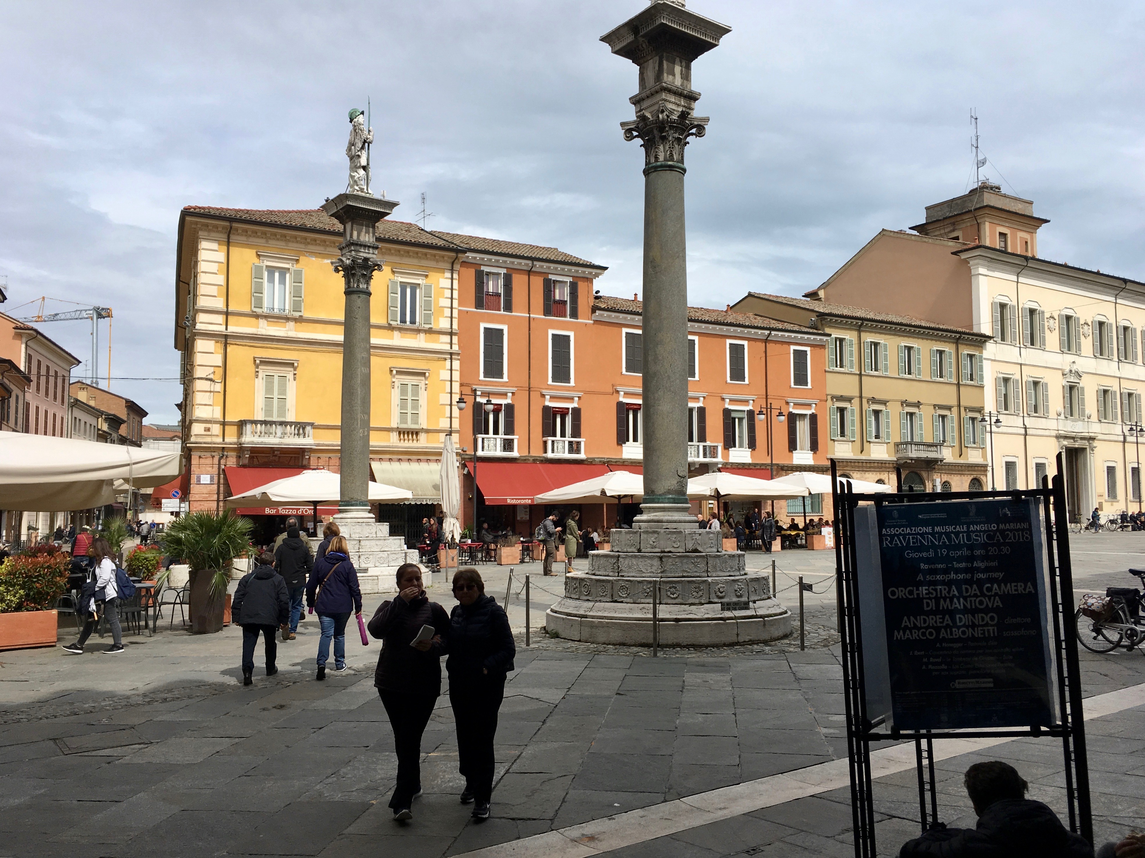 Ravenna has a charming center city that mostly consists of a couple piazzas and the streets that connect them to each other and to the monuments. Outside of that carefully preserved historical bubble, it’s a unprepossessing little burb with some truly unhappy architecture from the 1960s and 1970s salted amid the renaissance palaces. But if you stay on the path, it’s nothing but La Dolce Vita. Here’s the Piazza del Popoplo on a mild April day: