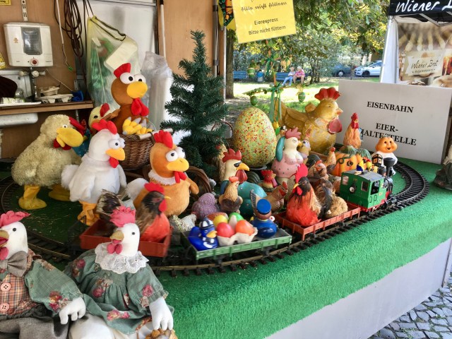But nesting challenges aside, it’s simply grand to be actually living in this vibrant, diverse, and whimsical city, a place I have loved since my first visit in December 2014. There is a lovely farmer’s market a few blocks away every Wednesday and Saturday, for example, filled with a variety of local delicacies but also a very amusing stand where the egg salesman sets up an electric train — and a bunch of stuffed chickens — to help attract buyers to his stand: