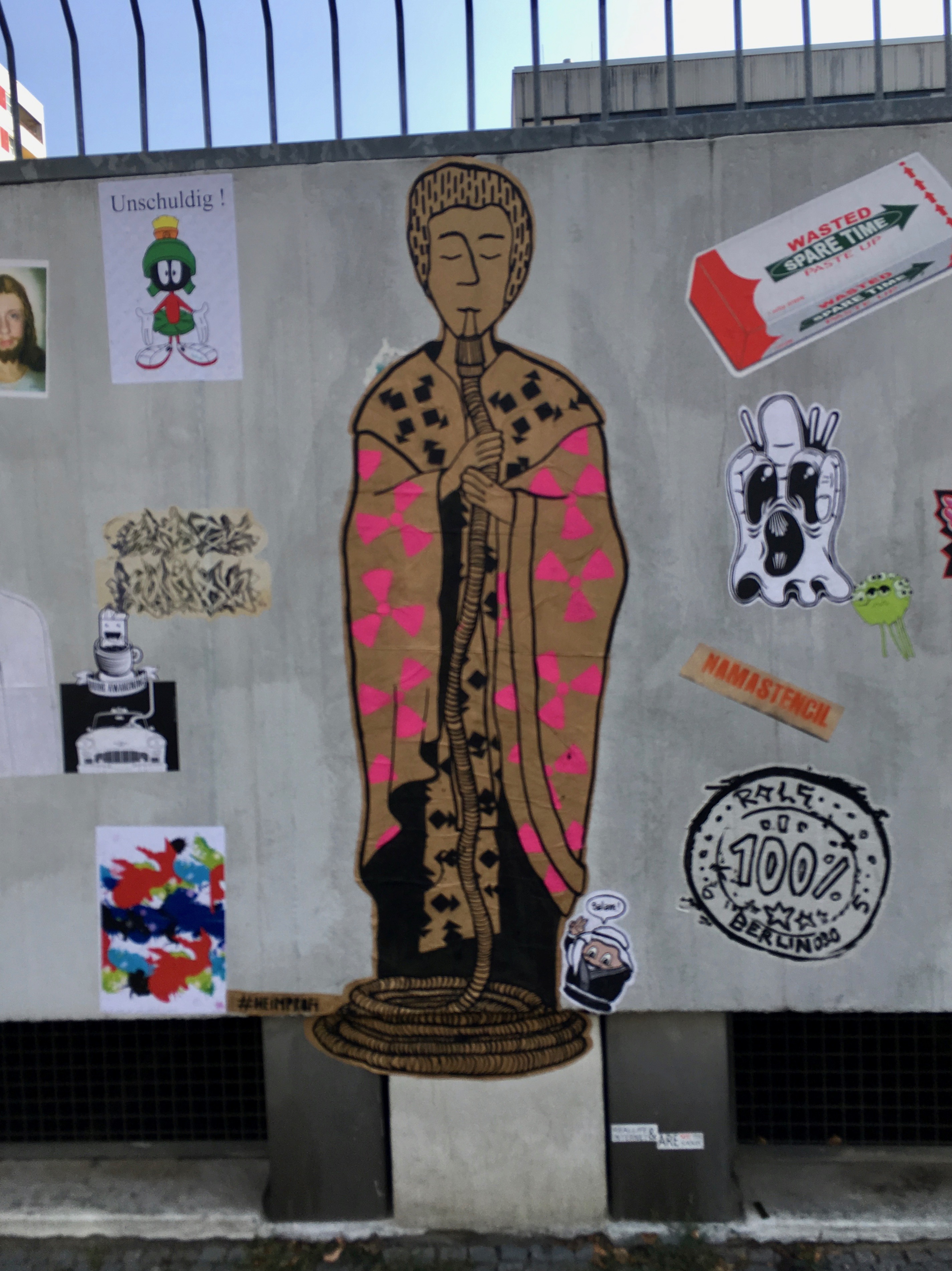 …and finally, no story about Berlin is complete with some of the local urban art, an exhibit of which has suddenly manifested itself on a construction wall nearby. Not exactly sure what a robed man is doing with a snake-like hookah, but that’s just part of the charm.