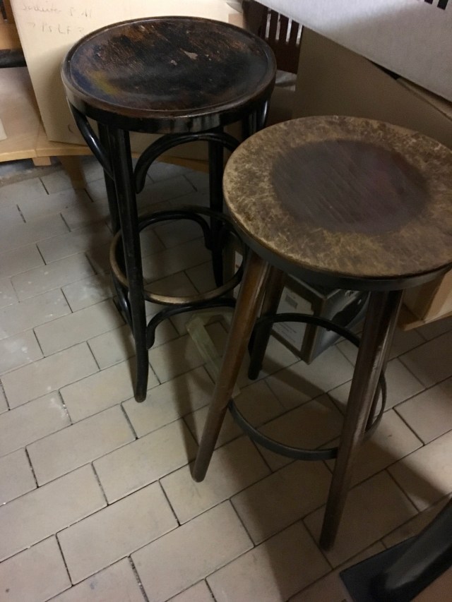 When these gentlemen left, we had, courtesy of our landlord who had forgotten he had promised this, a *basic* sink and stove. We bought the fridge (first purchase) and T added some shelves, so we’re in business in the short run. There have also been a few great contributions from friends, including these two stools who have cross-trained to become bedside tables: