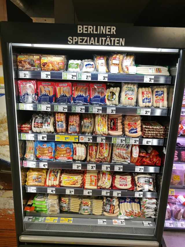 …and in one of the many local grocery stores, one is invited to purchase sausage from a range of local purveyors, a sight that T and I quickly dubbed “The Wall o’ Wurst:”