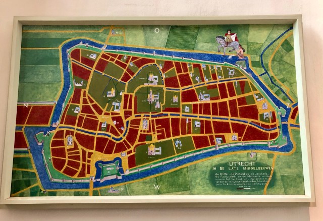 While Utrecht truly developed in the Middle Ages, as seen in the map above, there is evidence of Bronze Age habitation prior to the development of a Roman fort, Traiectum, which apparently denoted its location as a possible Rhine River crossing point. That name evolved into Trecht with the added leading “U” meaning “downriver.” The location of the fortress became the location of the Dom (cathedral), which is the green square in the middle of the map above, just over the small canal. The Franks turned Utrecht into a center of power for the Church and it has been known as the religious center of the country since the 8th century.