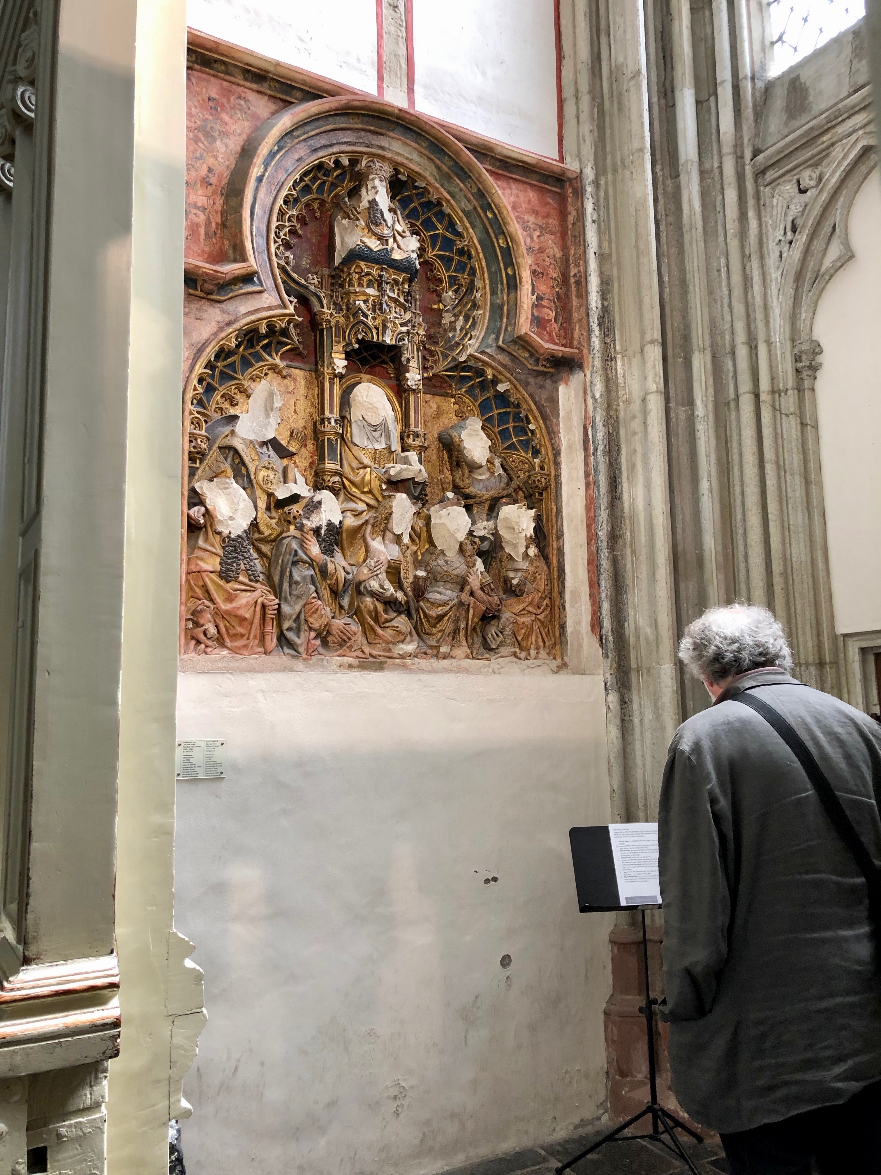 …and of course we dipped into the Dom to see if we could sense the leylines that we had been told ran through the site. Here T is boning up on his ecclesiastical knowledge and seeing firsthand the impact of the Reformation on the high arts in situ: