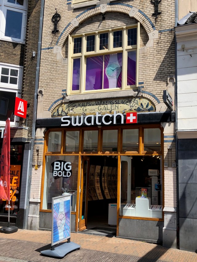 Here’s a Swatch store in what apparently had been a butcher shop in former times…if you can make out the writing over the door: