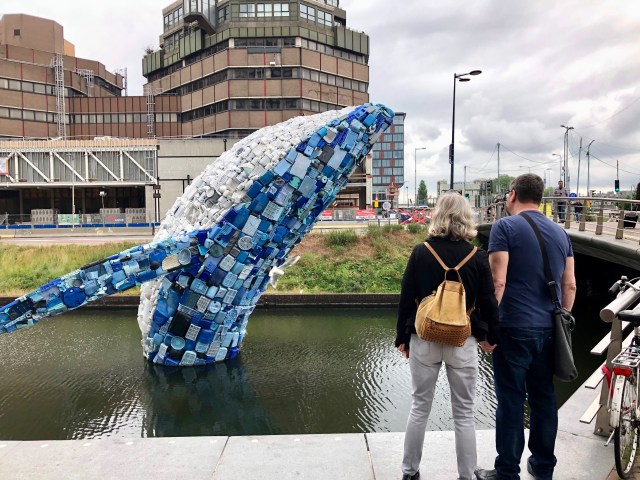 But for good or ill, Utrecht is not just a medieval village. Time marches on, and so does good and bad architecture. In the period of the 1960s or so, there was a movement to modernize the city, paving over some canals and building some new neighborhoods which, to my eye, are an acquired taste. Here’s an example along with some canal-side animal art that appears to have an environmental and recycling theme:
