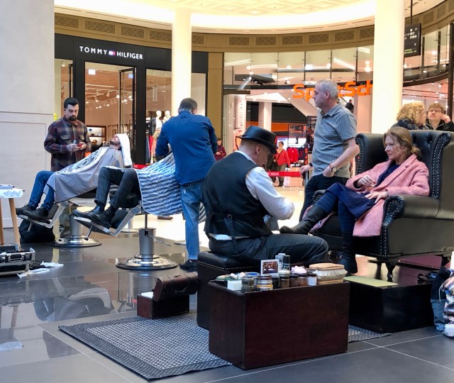 …a small barbershop and shoe shine establishment. There was also, to the left of this shot, two massage chairs and a very long line of hopeful clients. What the heck? I asked the concierge, and he had no idea. Just a way to bring people into the mall, and to soften them up for some last-minute winter sales bargains. To that end, there was even…free champagne (and orange juice, for the non-imbibers). I said to myself, self I said, “Carpe diem.”