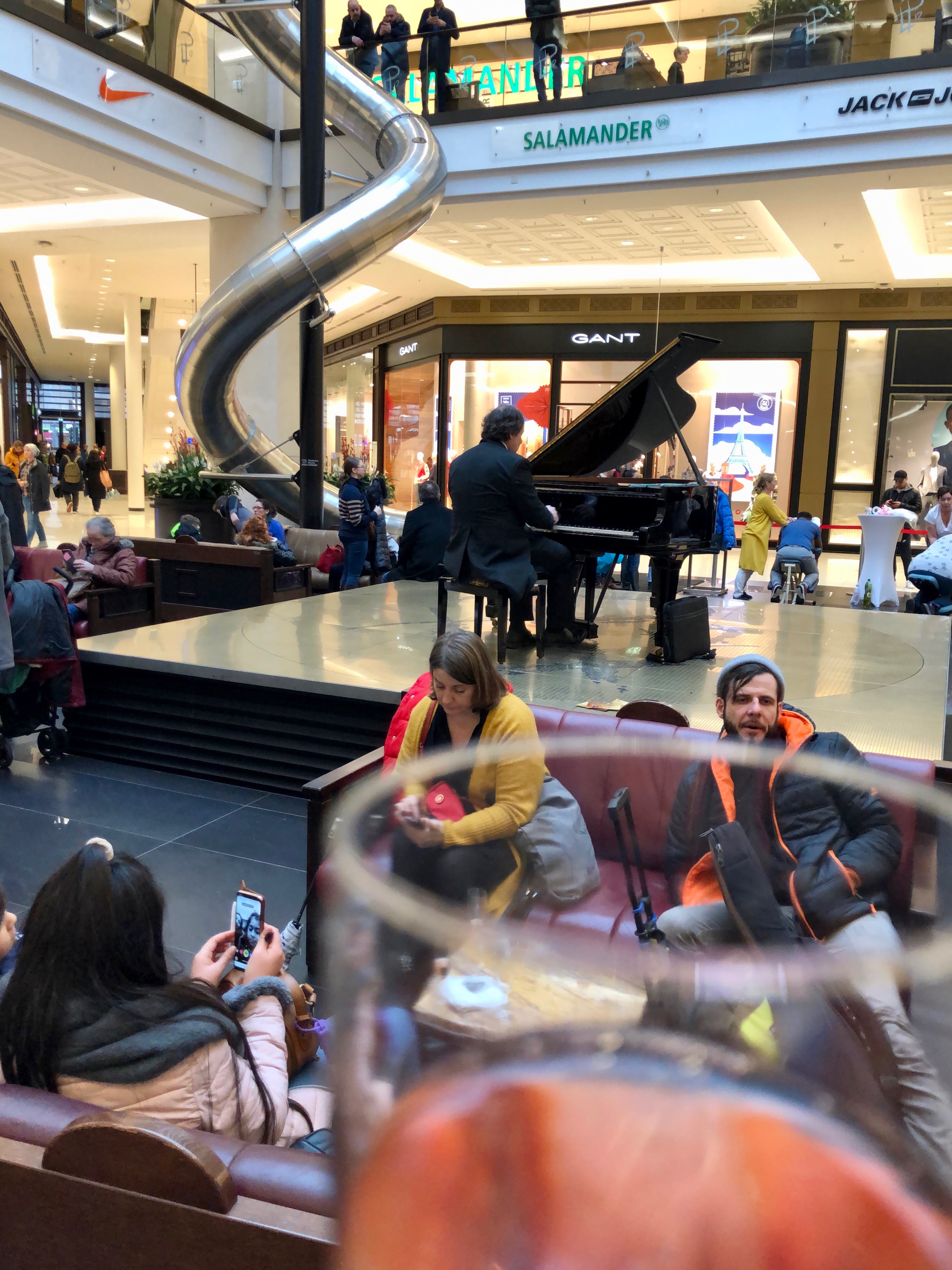 However, today the place was buzzing. Buzzing, I say! And I soon found out precisely why. The Mall was throwing a party, and we were all invited. In the atrium area, in addition to the piano player, there was….