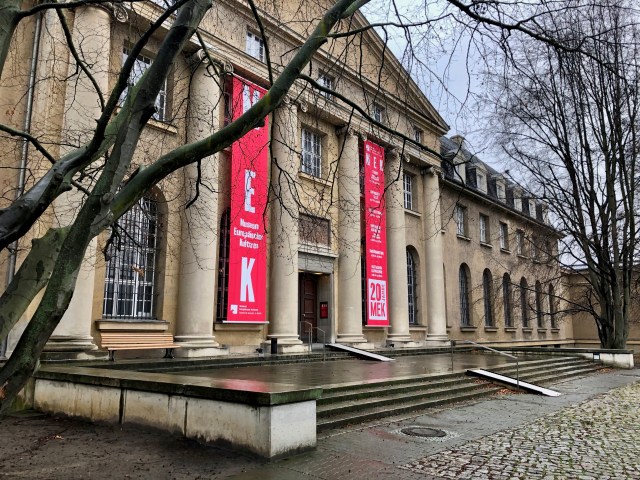 This past Sunday I headed off to to one of the more obscure cousins in the collection – the MEK, Museum Europaischer Kulturen, Museum of European Culture. It’s located in the suburb of Dahlem Dorf, one of the higher priced spreads in town, and nearby the Freie Univeristat. Here’s a shot of the rather imposing front entrance: