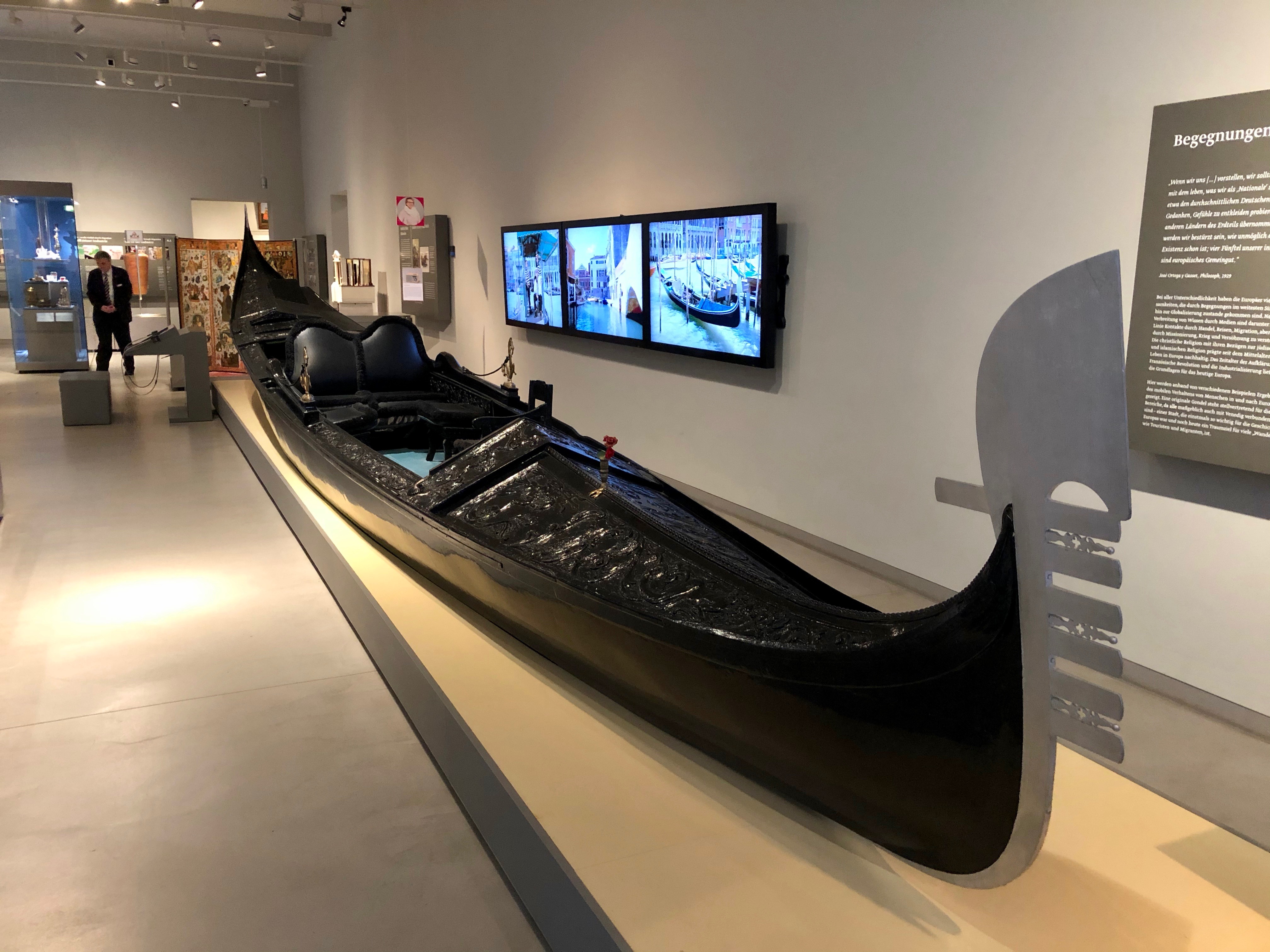 I was impressed that the museum’s collection is currently organized around the idea of migration and cultural contact – a subtle but effect jab, IMHO, at some of the nationalism and xenophobia trying to raise their ugly heads. The exhibit made the point that people have always been moving about the globe in search of better lives, and that the European experience is just all the richer for it. The first item that greets the visitor was this lovely Venetian gondola, dating from around 1910: