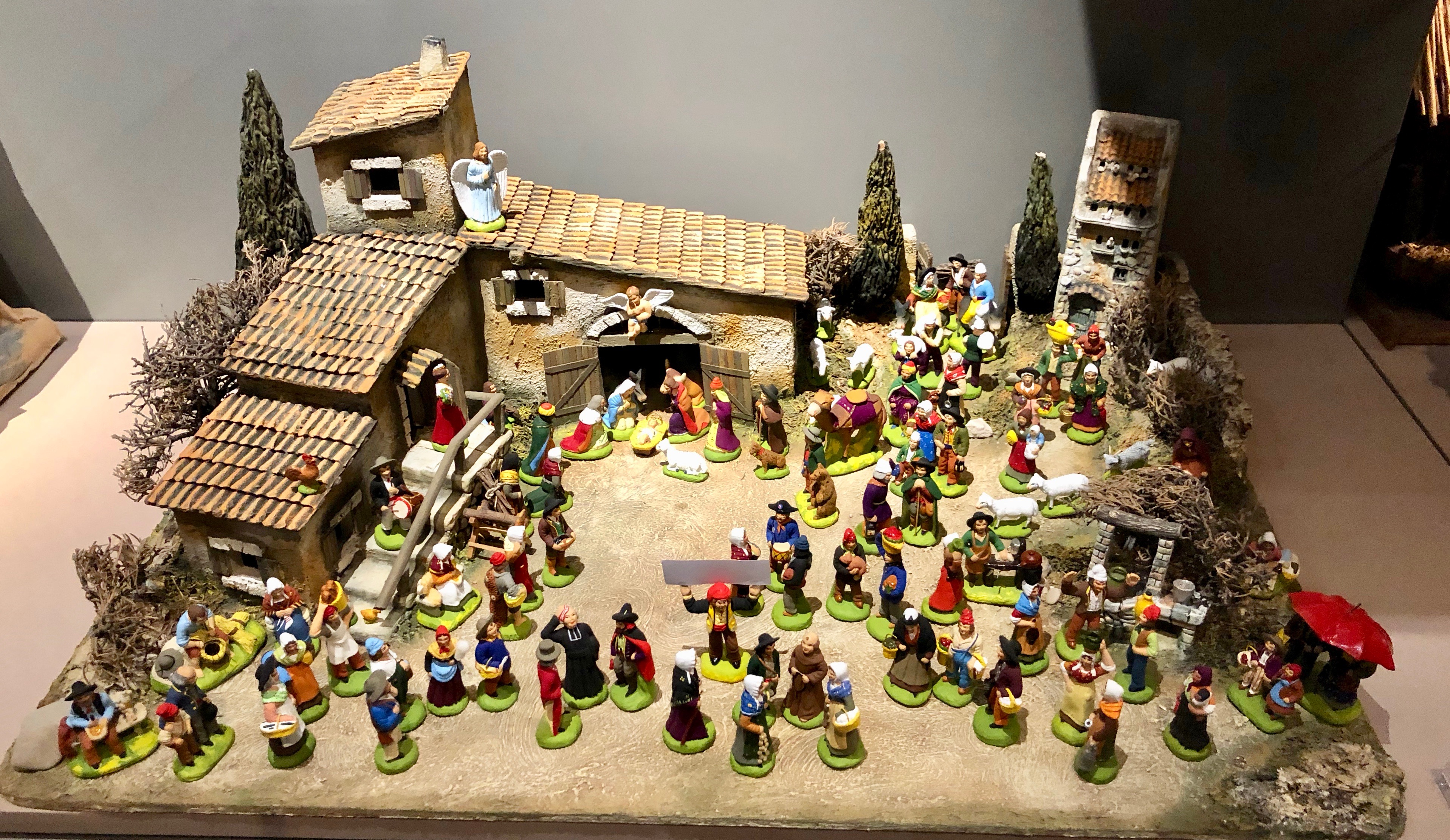 The first scene is from the Provence region of southern France, and features “santons,” or small saints, typical of the region. Farmers in regional garb and various tradesmen complete the scene around the Holy Family. This is a mid-twentieth century imagining of life in more medievally times: