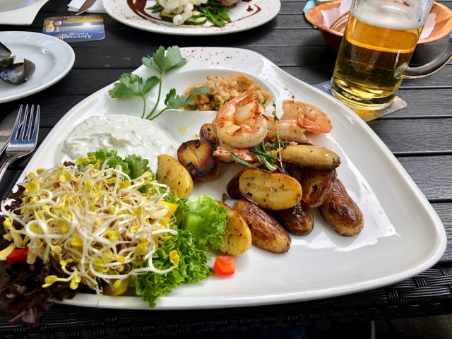 I normally don’t take pictures of food and am ungenerously quite dismissive of those who do. Buuuut, we had dinner in Schleswig at an unprepossessing little cafe…that simply blew my socks off. Food, I must say, is one of the very few disappointments in Berlin; at my price point, it’s decent but not very interesting. But for an extremely reasonably priced meal, this was a show-stopper – grilled shrimp and potatoes, a glorious veggie salad, and what you can just barely see at the top of the place, a delicious chickpea/grainy/curry thing that was amazing. Oh, and an excellent local beer that we’d never heard of. *This is the reason you go off the beaten path.* Cheers, Patio!
