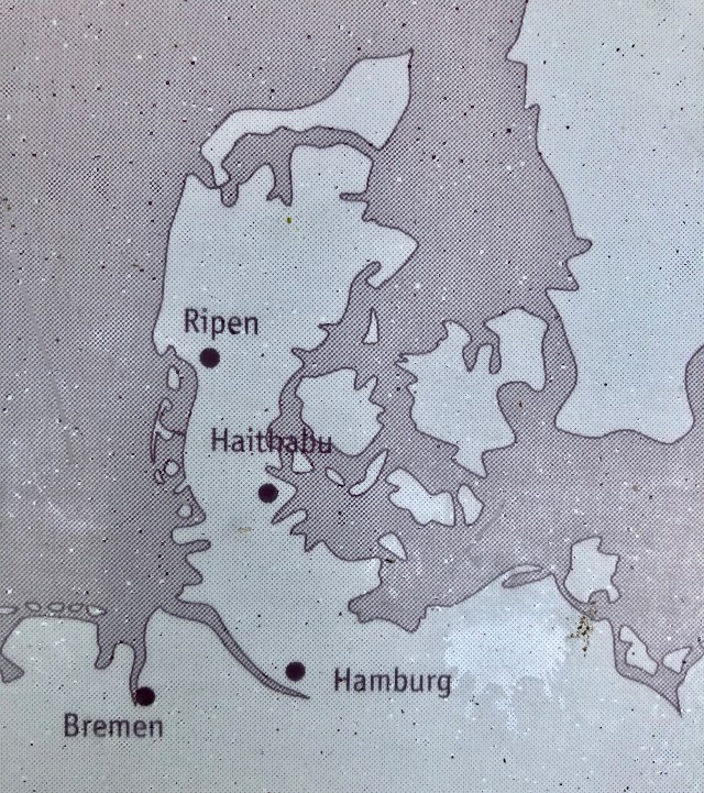 The next day, we headed across the bay to Haithabu (Danish: Haddeby), a destination that I have longed to visit for quite some time. If any of you have read or watched “The Last Kingdom” series (BH, I know you have), Haithabu is frequently mentioned there, the big Danish trading site where all the toothsome women and young children captured in battle are sold into slavery for transport to points south. Just for your point of reference, here’s a map showing its location: