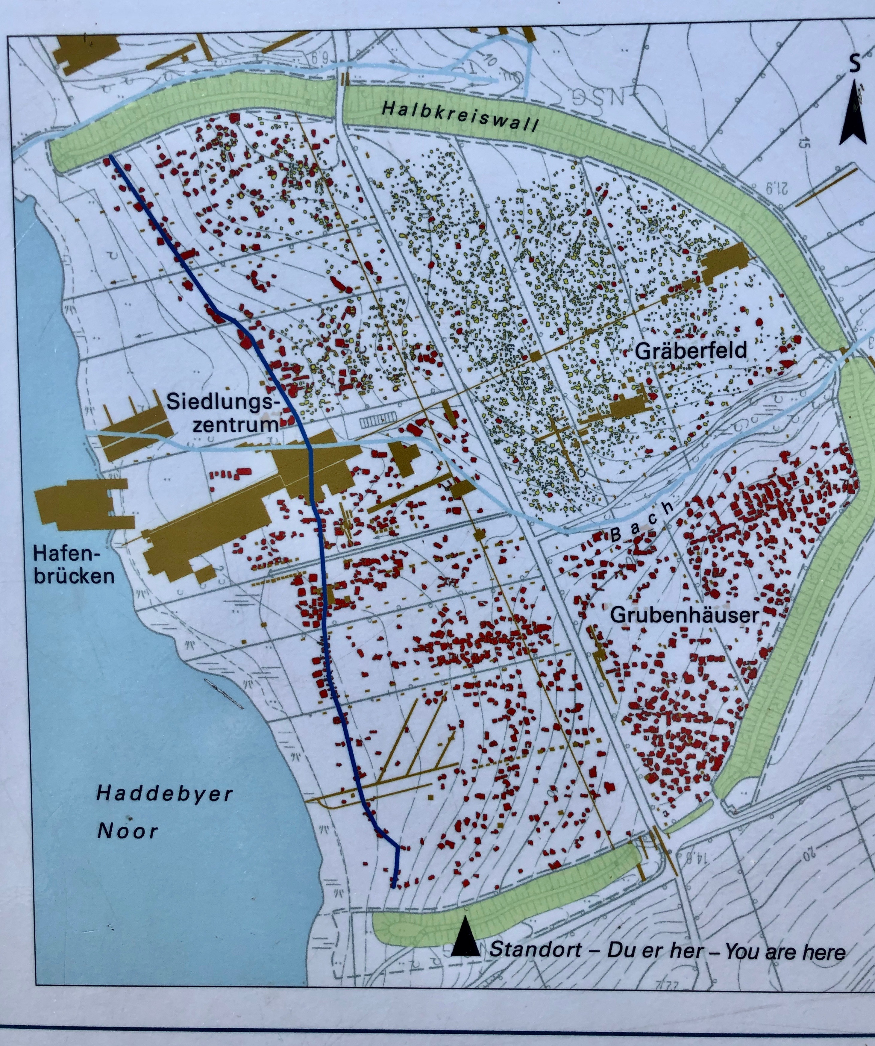The next day, we headed across the bay to Haithabu (Danish: Haddeby), a destination that I have longed to visit for quite some time. If any of you have read or watched “The Last Kingdom” series (BH, I know you have), Haithabu is frequently mentioned there, the big Danish trading site where all the toothsome women and young children captured in battle are sold into slavery for transport to points south. Just for your point of reference, here’s a map showing its location: