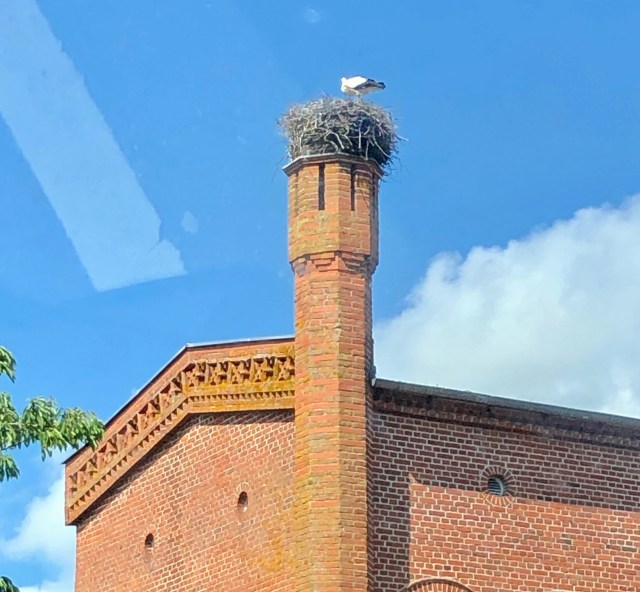 Back on the road, on our way to Stralsund, my dear spouse pulled a dramatic U-turn and blew dust up a country road to show me something he knew I had always wanted to see – a stork on its nest. Storks to us in the US are rare sightings and their personal habits – mated for life, extraordinary migration patterns returning always to the same locale – are the stuff of legend. Blog, meet my closest stork encounter to date: