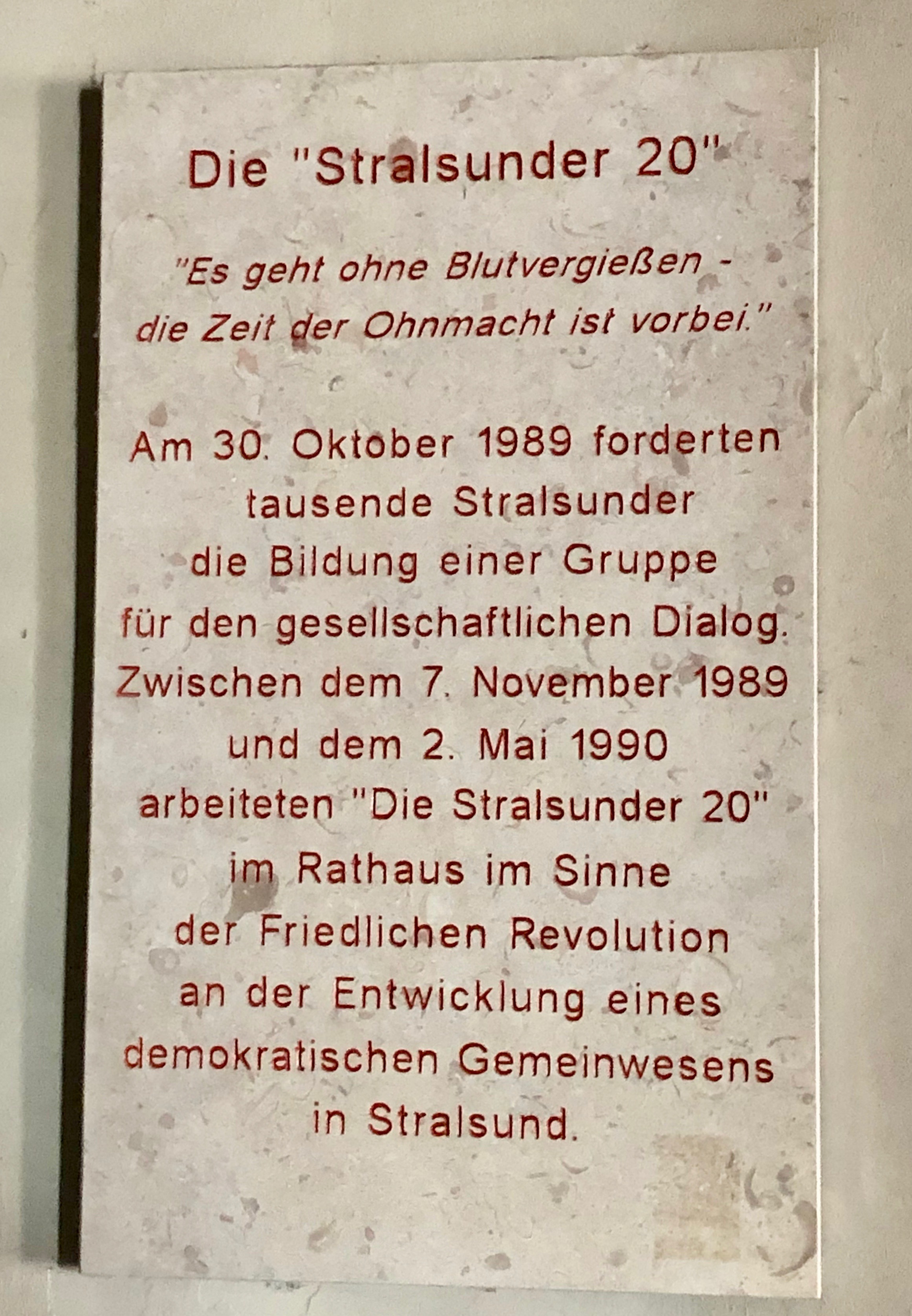 In rough paraphrase, “It’s possible without bloodshed. The time of oppression is past.” ‘On the 30th of October, 1989, thousands of Stralsunders demanded the establishment of a group for social dialogue. Between the 7th of November 1989 and the 2nd of May 1990,” The Stralsund 20″ worked to define the peaceful revolution and the development of a democratic community in Stralsund.’ Lovely to have that permanent reminder for all to see.