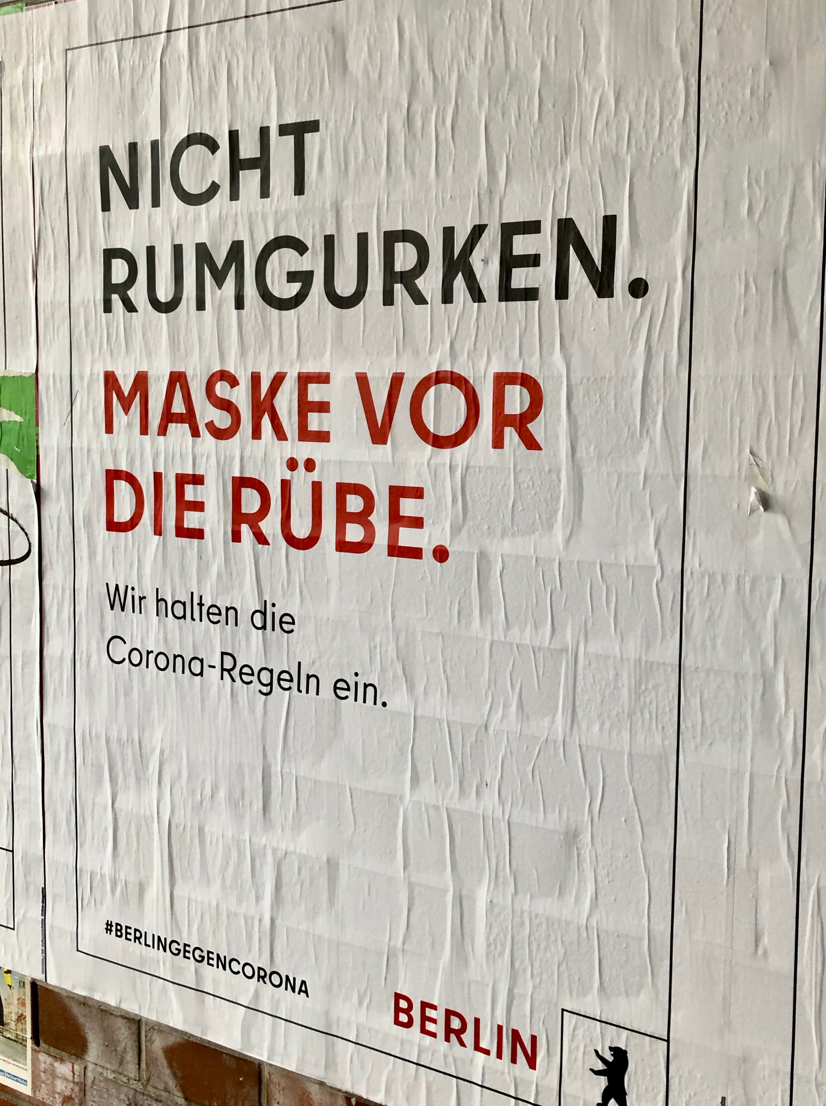 Nearby was the most curious “COVID compliance” sign I’ve seen yet. I think the translation is: “Don’t cucumber. Mask for the beet. We abide by the Corona rules.” Clearly my German is still not yet quite up to par. Corrections grateful accepted: