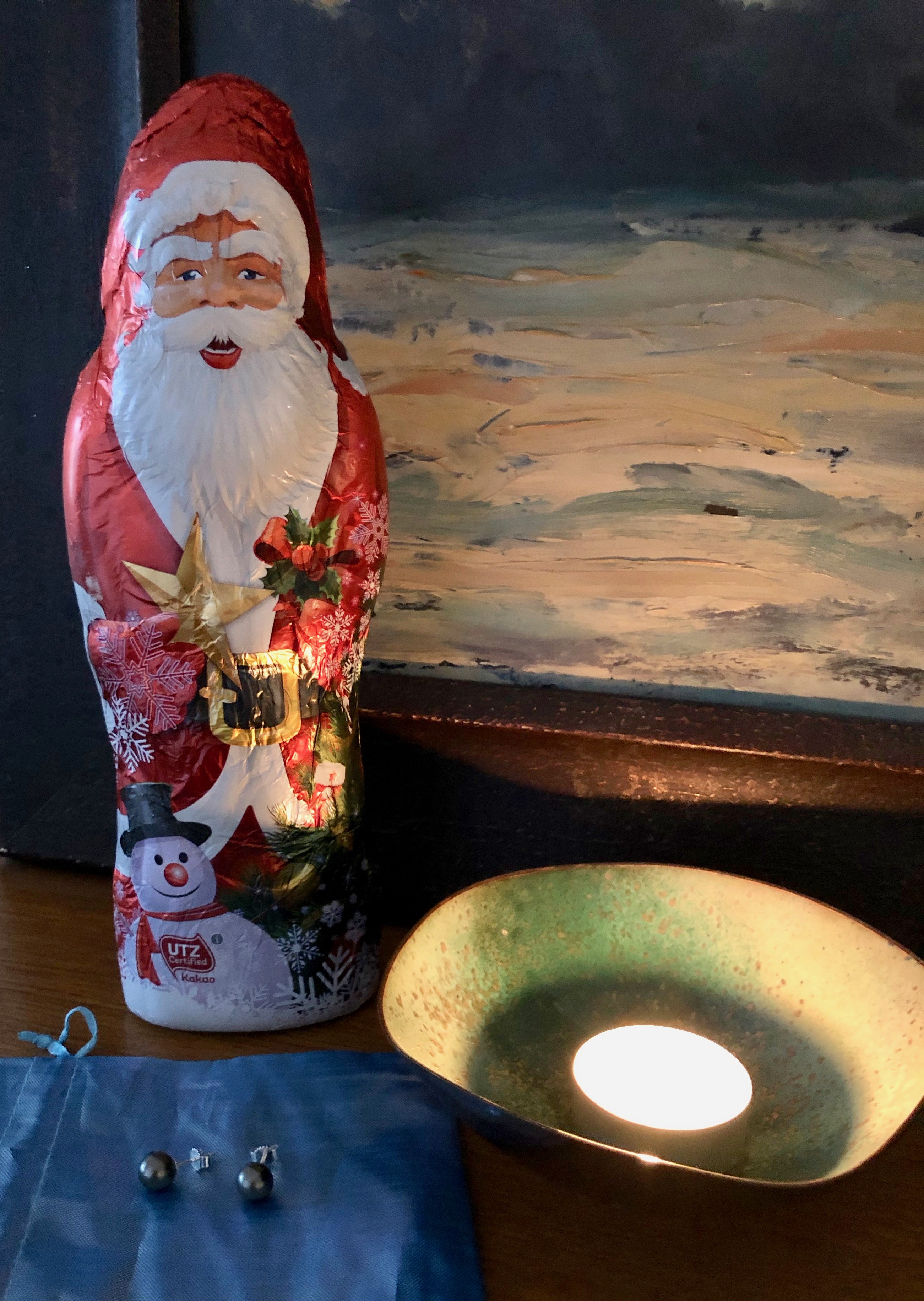 Back home again, much improved from my five kilometers and my brief brush with conviviality, I thought I would show off one of my treasures from today. I “elfed myself” with a lovely pair of 15 euro knock-off pearl earrings from my favorite German and Thai jewelry store. Merry Christmas to me.