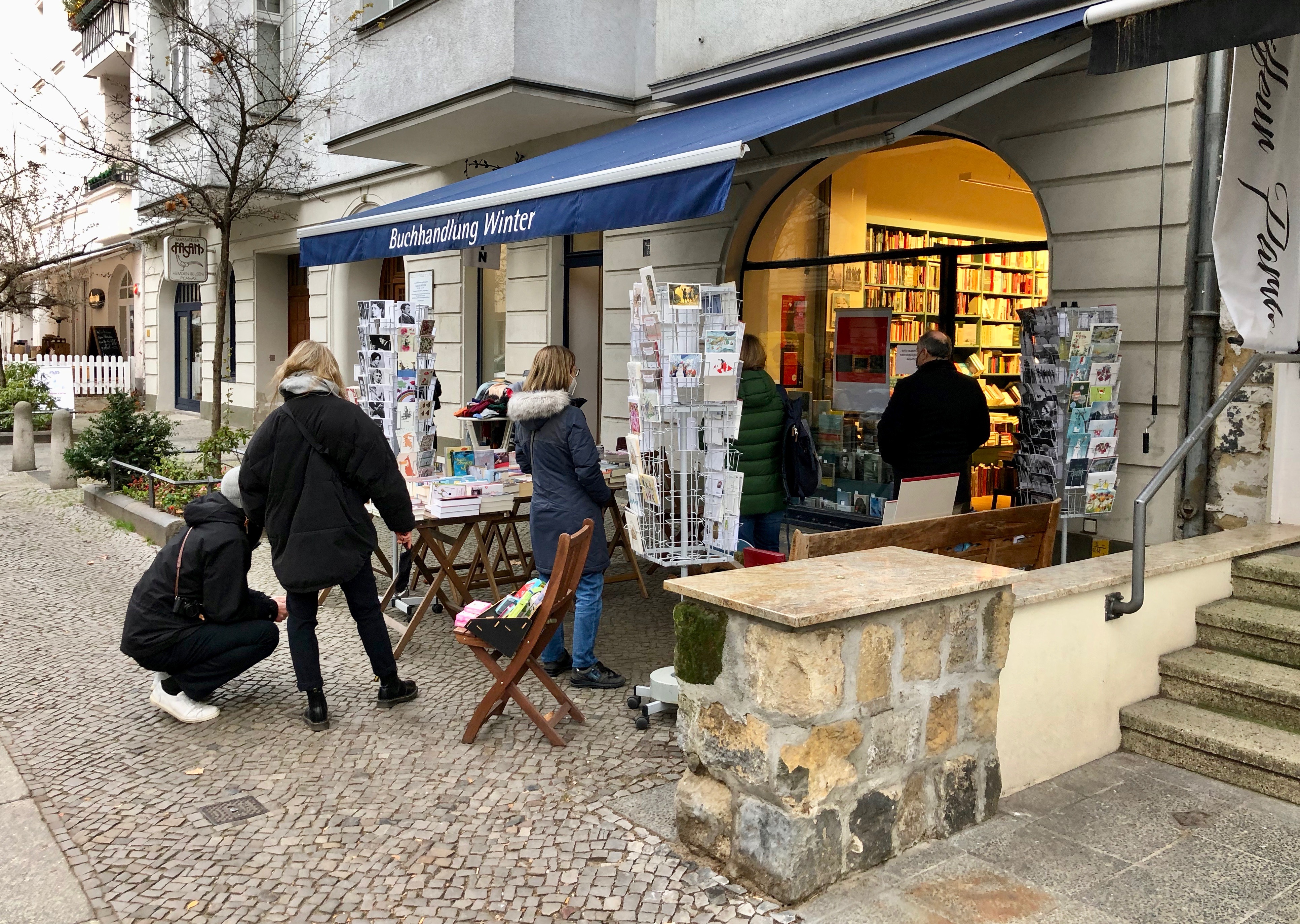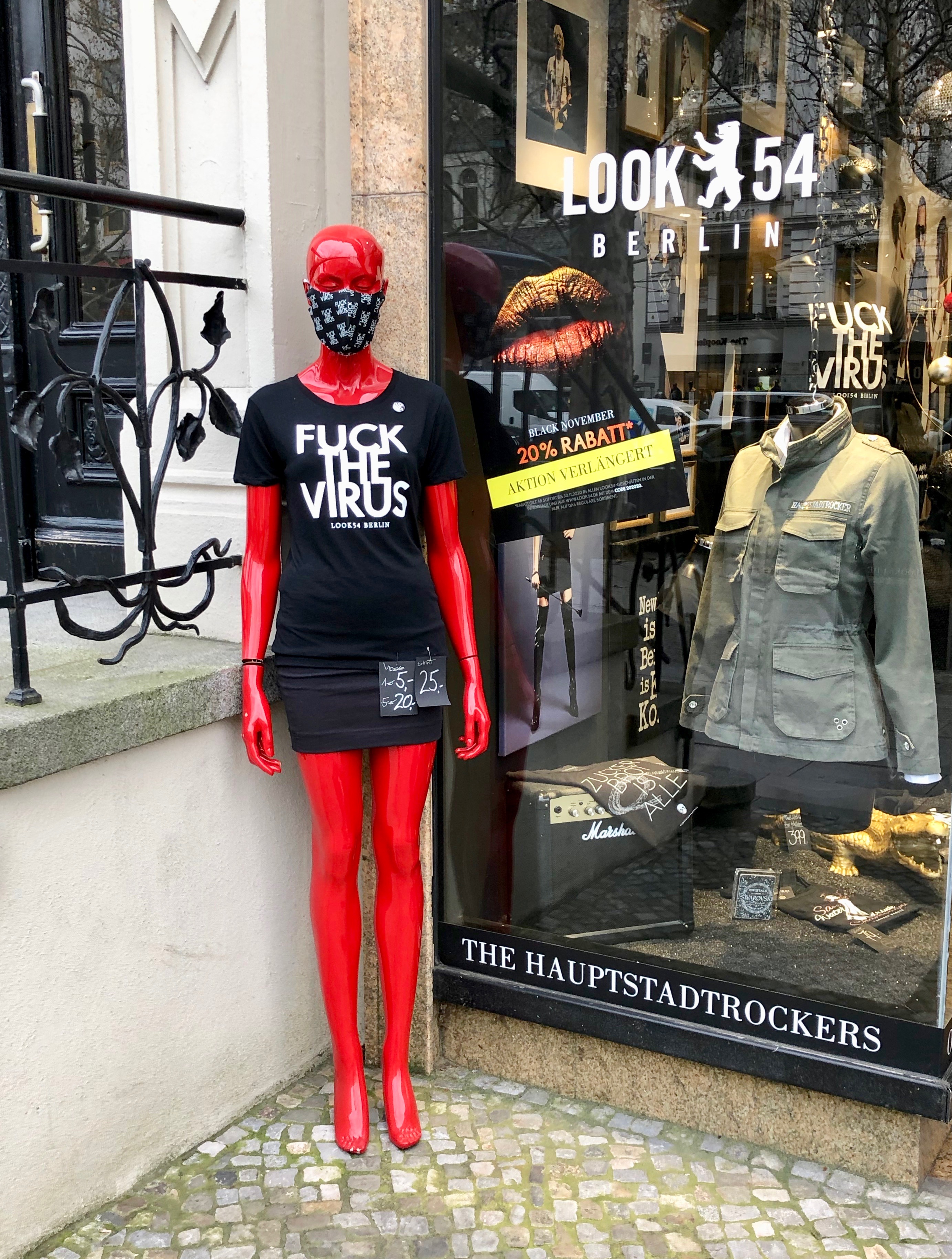 But just walking down the street, Berlin’s famed Kurfürstendamm, things looked, well, more or less normal for a December afternoon. Folks were out strolling about and queueing for shops and chatting with friends. Not surprisingly, Berlin’s edgy humor was, as often is the case, on full view: