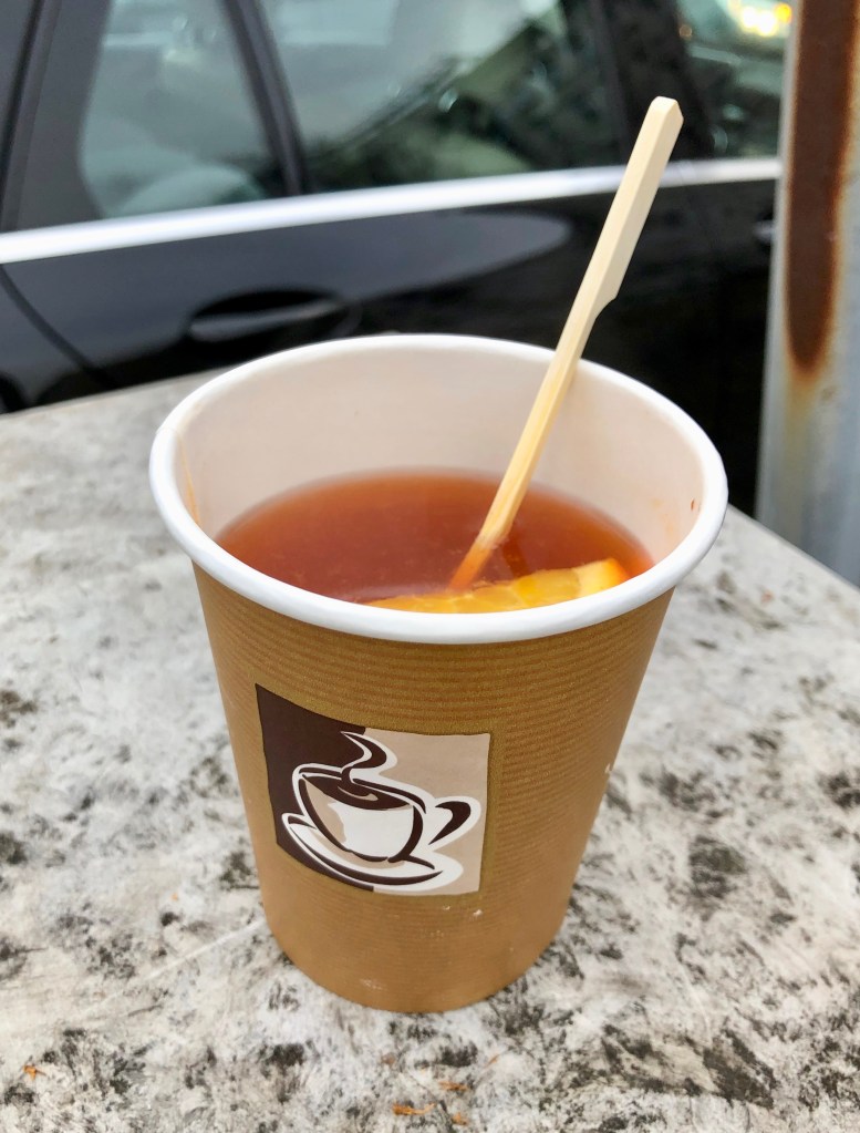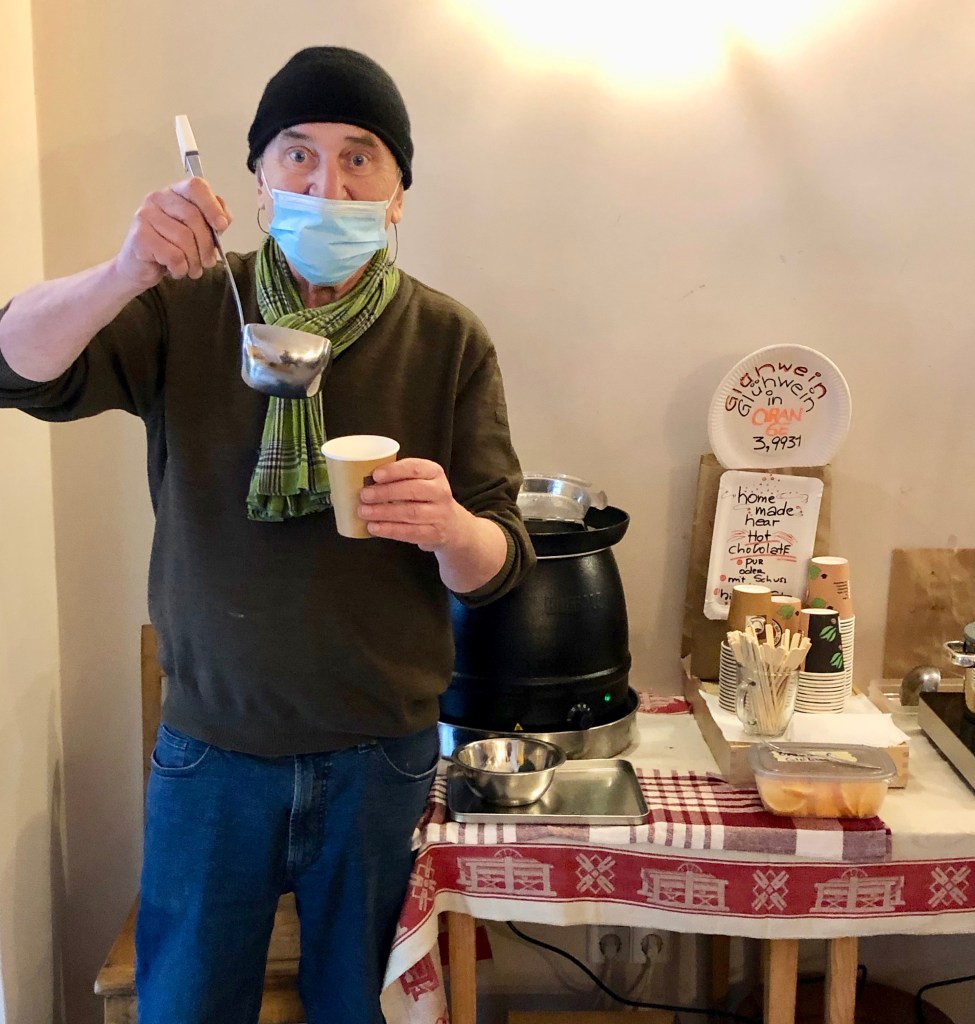 Well, by now as is so often the case, I was cold and thirsty. Happily, this past weekend I had discovered a lovely little delicatessen not far from my house that served up a damn fine white wine “Glühwein” with orange slices, so I dropped in for another dose. The proprietor graciously agreed to pose for me pre-dip: