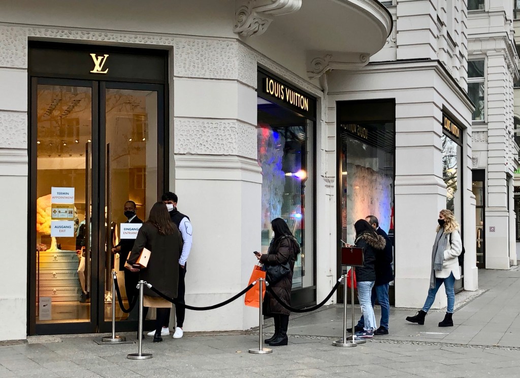 Not surprisingly, having been given exactly two days to prepare for a four-week Christmas-and-New-Year’s lockdown, people were doing their level best to get everything done by asap. Although Escada and Versace have given up the ghost and just shut down entirely, Louis Vuitton, still functioning, had seen fit to give people appointments (Termin) to make sure everyone got their LV swag in an orderly fashion: