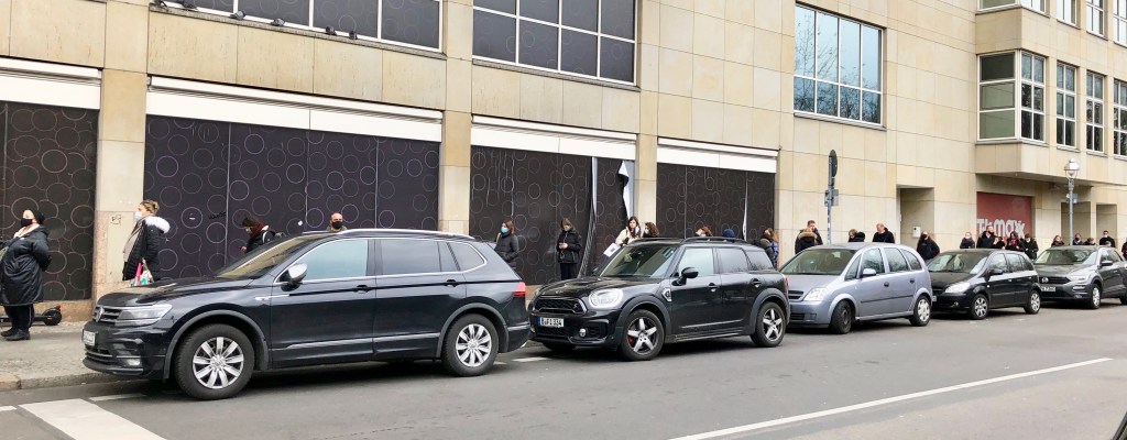 I headed away from the fancier neighborhood back toward my more modest neck of the woods. And here, of course, another line, this one for TKMaxx, the local version of TJMaxx, this one much longer. This line in actuality extends twice as far as you can see here, everyone queueing patiently. Thank god for iPhones: