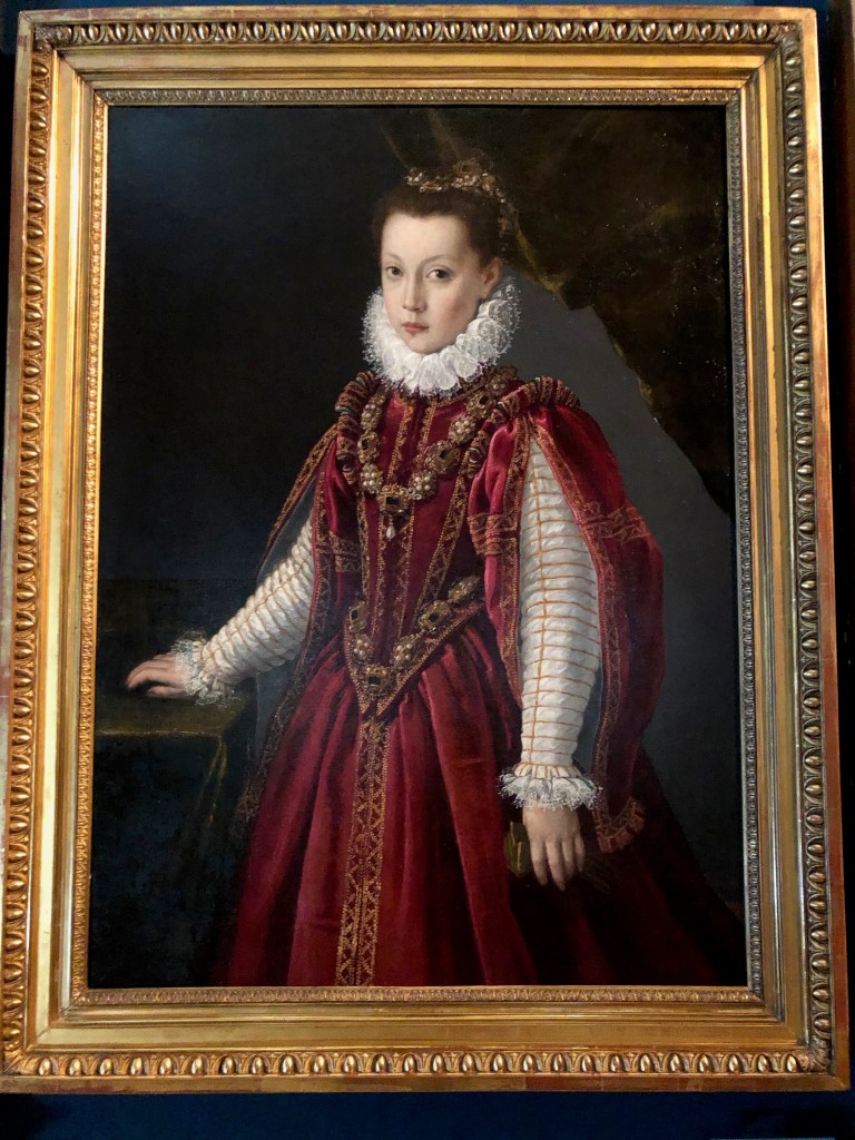 No-one seems to know who this person is, except that she was a noblewoman in the court of Phillip II of Spain, the location where the artist was working (more about that in a moment). The descriptions I found only spoke to her “serene expression,” her dress and ornate embroidery, the detail in the ruff, the jewels in her hair. She’s holding gloves, perhaps an indication of outside wear. But, IMHO, this girl is hurting, and I wanted to know more.